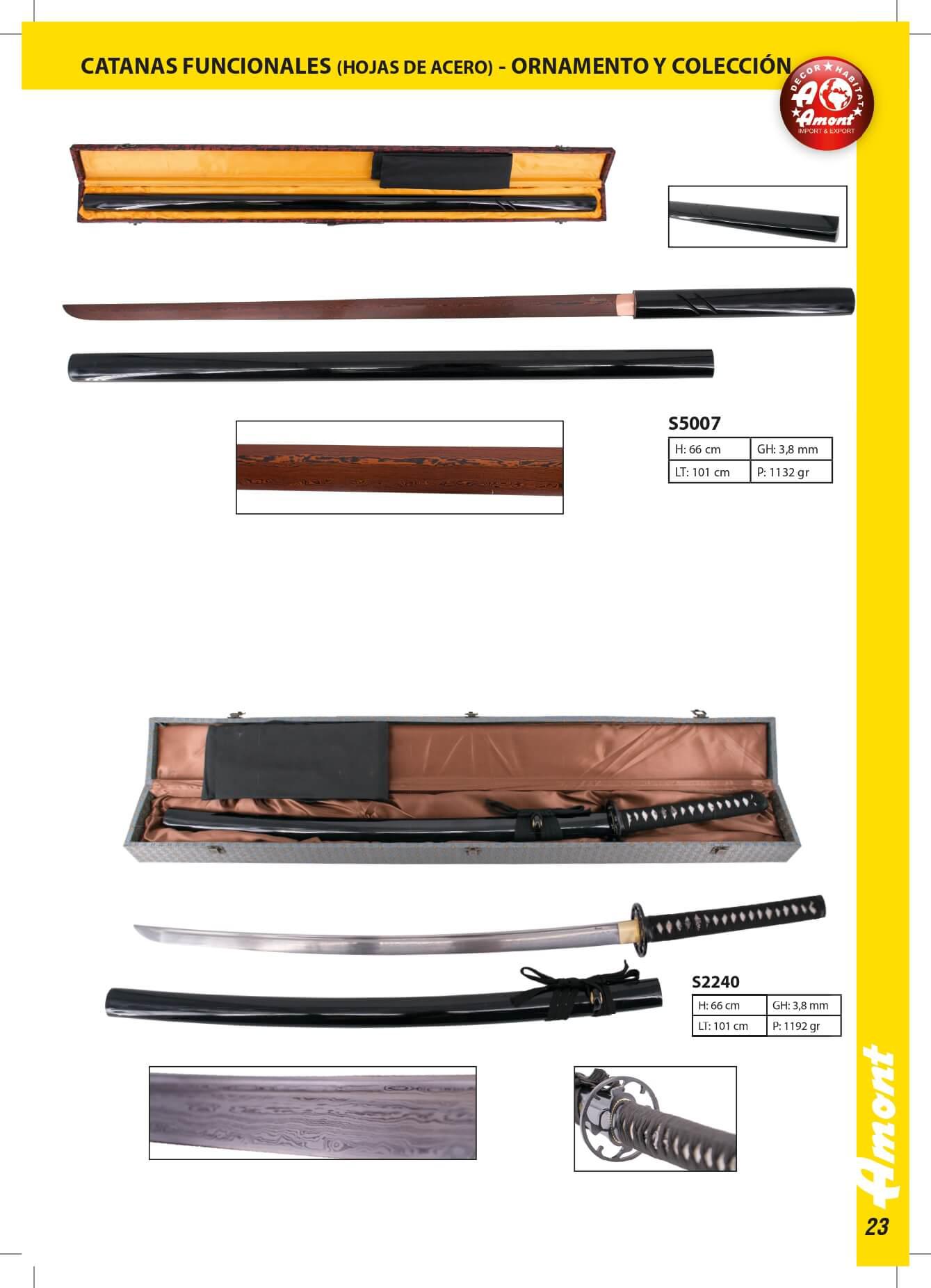 Katana S2240 de 102 cm AISI 1045 lâmina de aço damasco com fio, com bainha preta e cordão preto, cabo com cordão preto, com suporte e caixa de madeira forrada com tecido decorativo de apresentação.