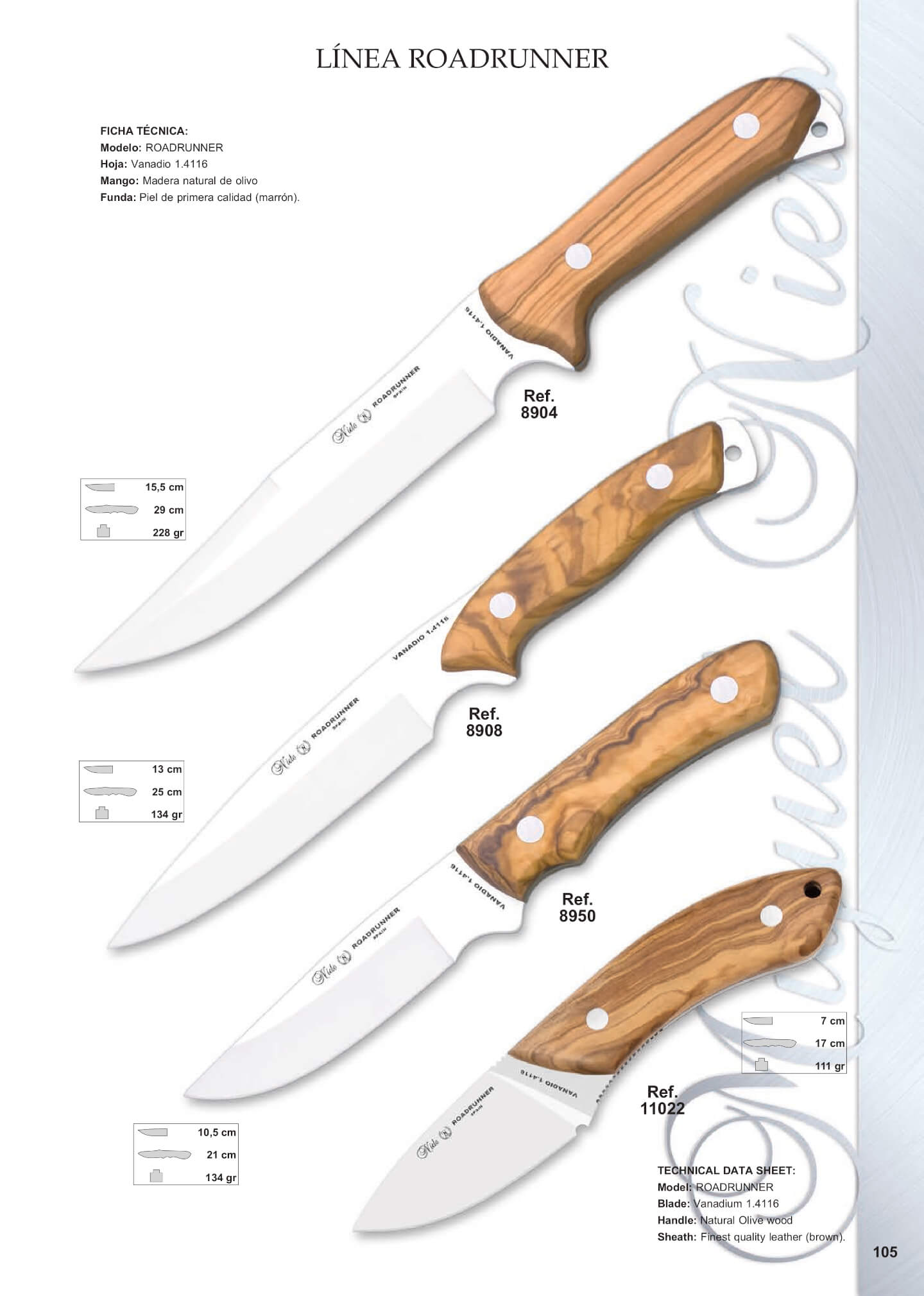 Hoja de acero Vanadio 1.4116, mango de madera natural de olivo y remaches de acero inox 330. Funda de piel de primera calidad (marrón).