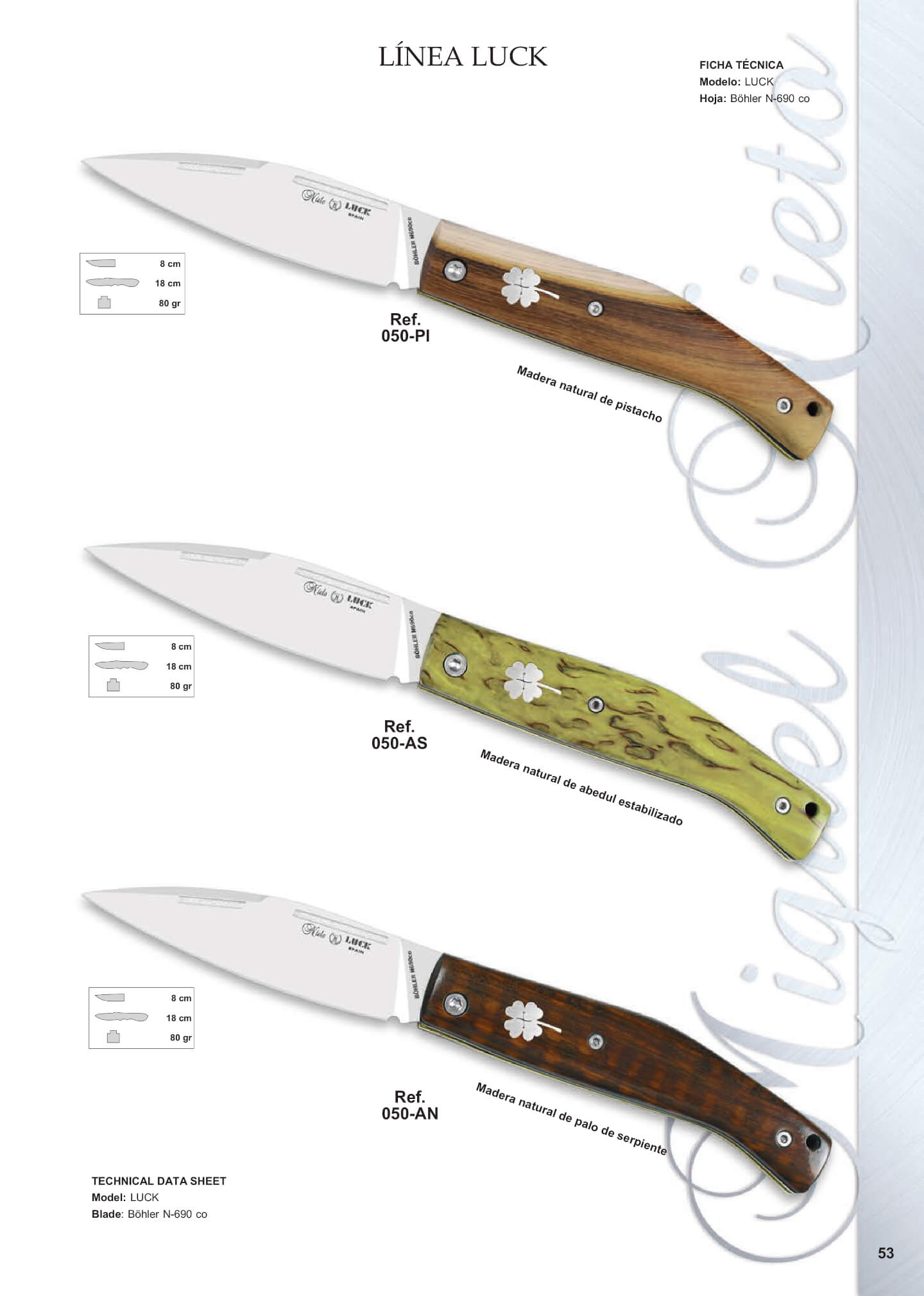 Coltello tascabile Nieto Luck con lama in acciaio Böhler N690Co da 9 cm e manico con quadrifoglio decorativo.