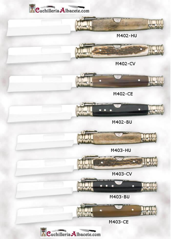 Navaja Punta cortada, virola y rebajo en alpaca, hoja de acero 440 o Acero de Damasco.