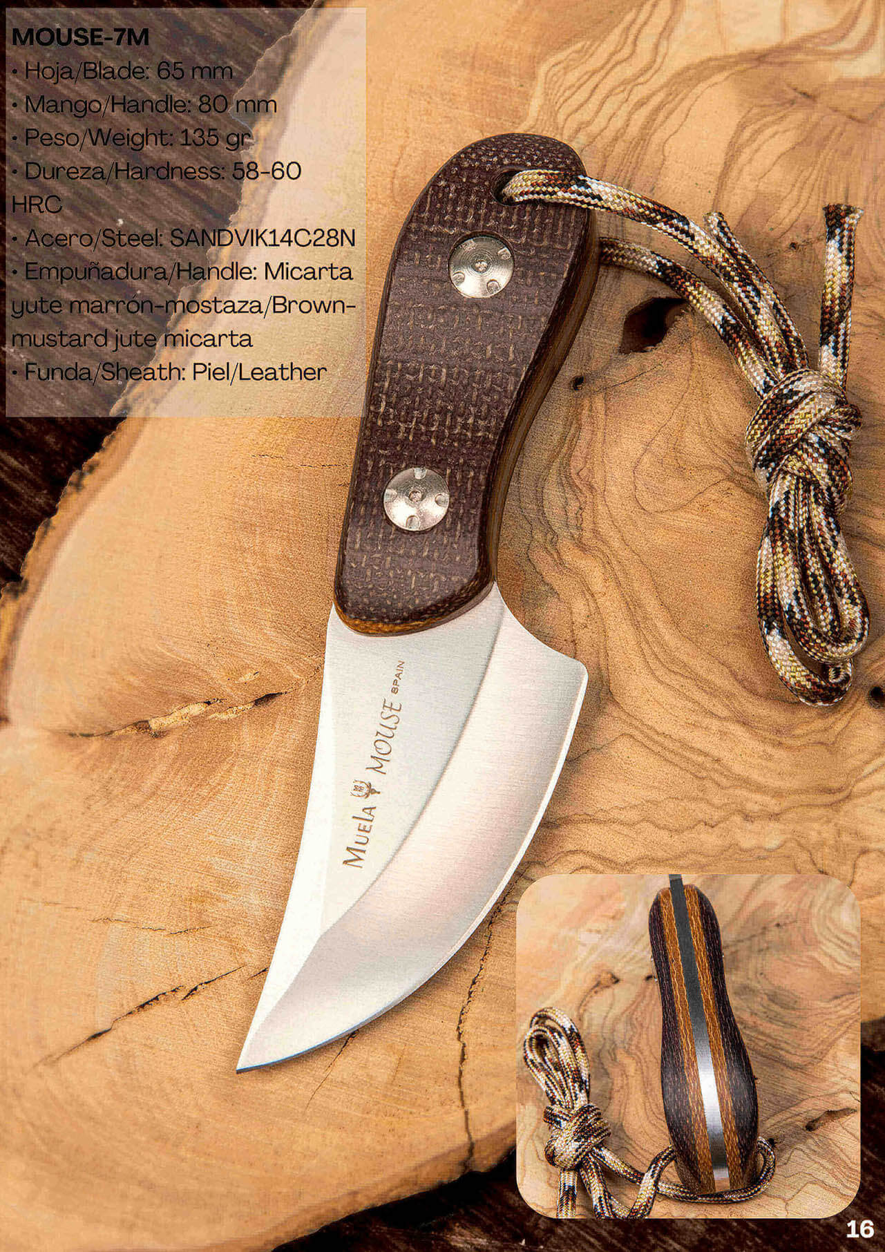 Un petit couteau de chasse avec une lame pleine soie en acier inoxydable Sandvik 14C28N de 6,5 cm de long. Son manche est en micarta de jute marron. Comprend un étui en cuir.