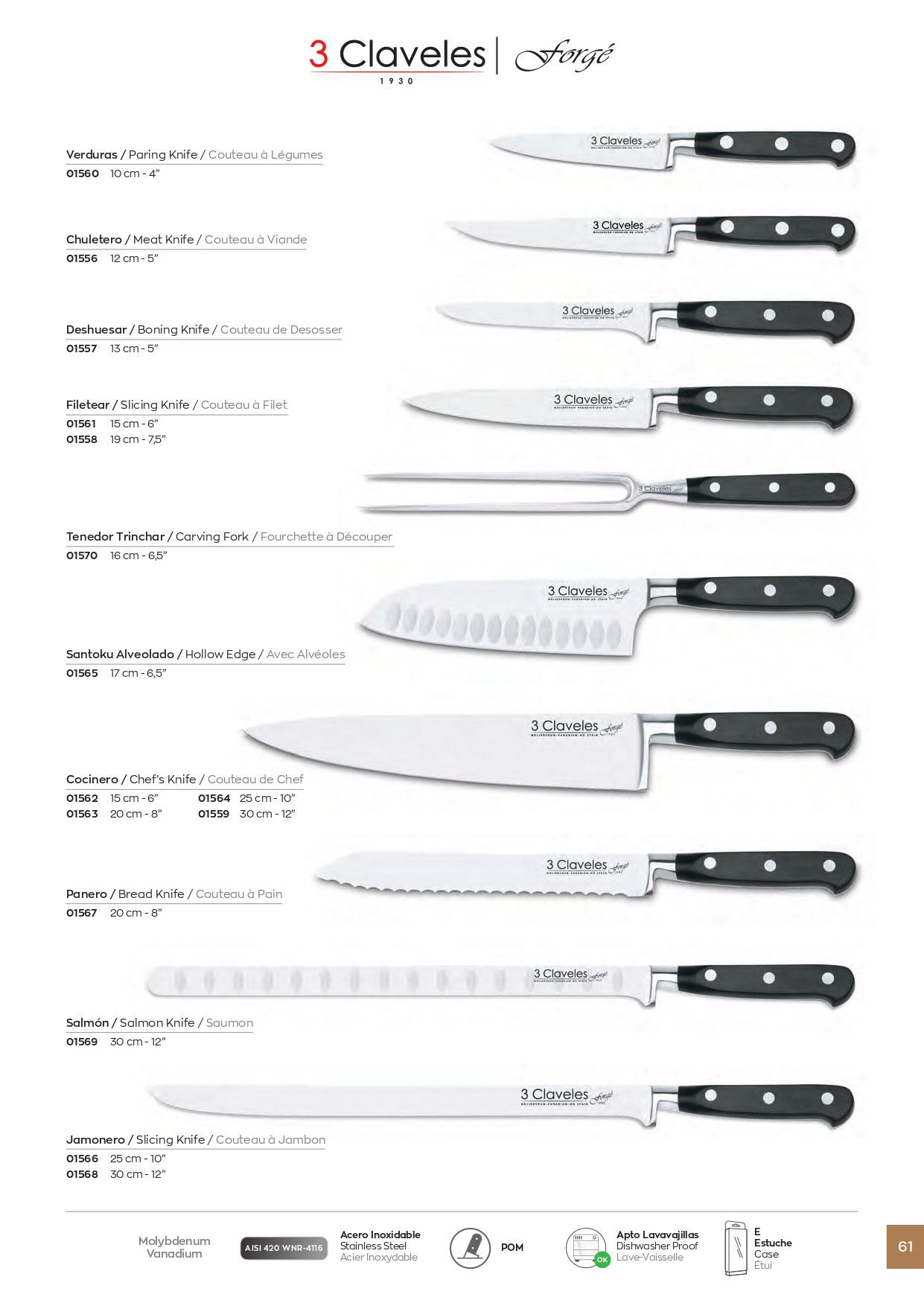 Facas forjadas de aço inoxidável AISI 420 WNR-4116. Cabo POM ergonômico, resistente e confortável. Lâmina de aço inoxidável e cabo POM. Faca de legumes, cozinheira, pão, bife, desossador, filé, garfo trinchante, santoku.