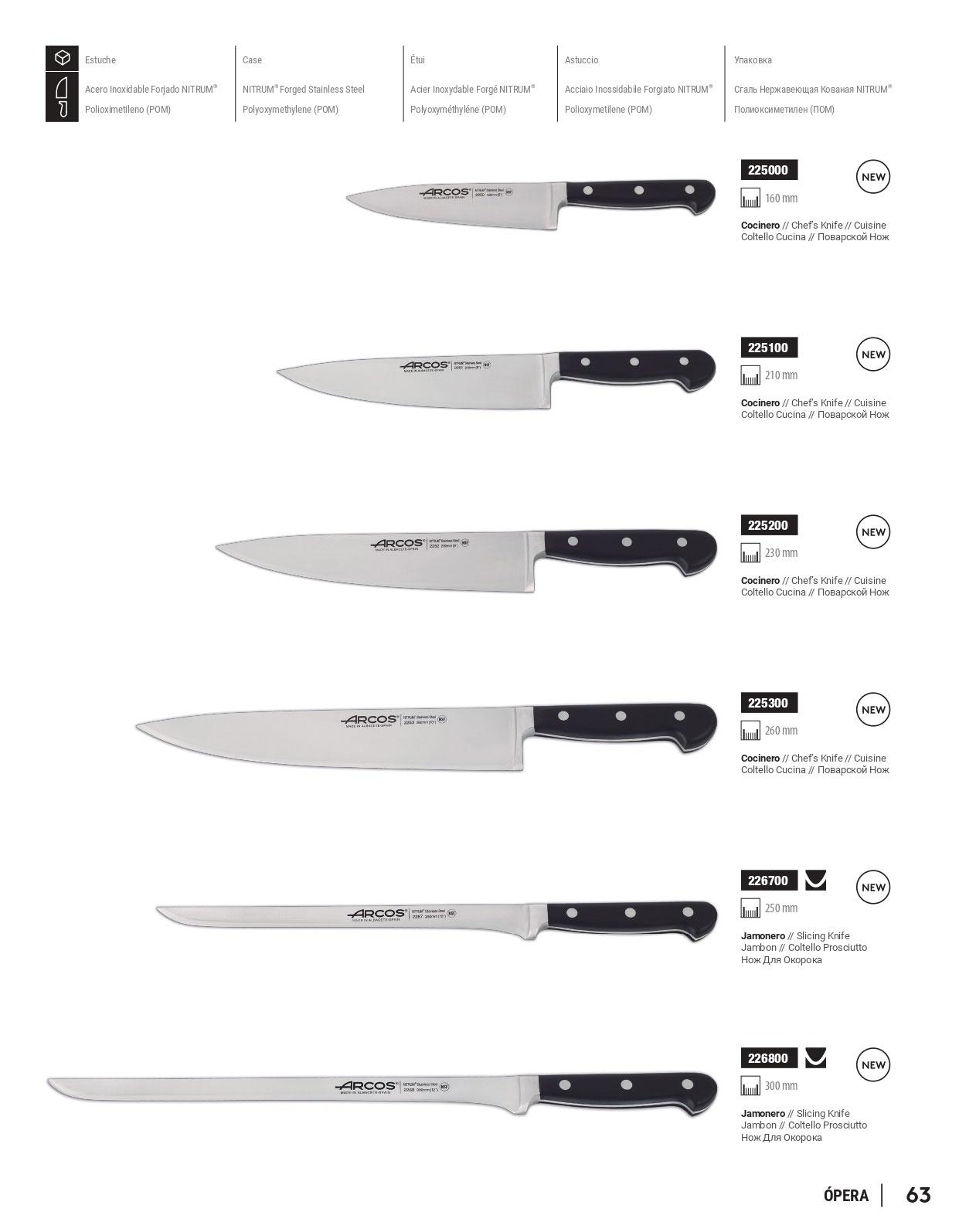 Facas com lâmina forjada em aço inoxidável NITRUM e cabo de polioximetileno. Faca de chef e faca de presunto.