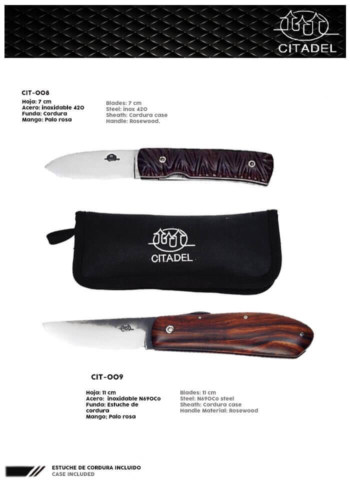CIT-008: STAVANGER WOOD ZEBRA Lâmina: 7 cm Aço: 420 Aço Inoxidável Bainha: Rosewood CIT-009: PHAN THIET WOOD Lâmina: 11 cm Aço: Aço Inoxidável N690Co Bainha: Cordura case Puxador: Rosewood