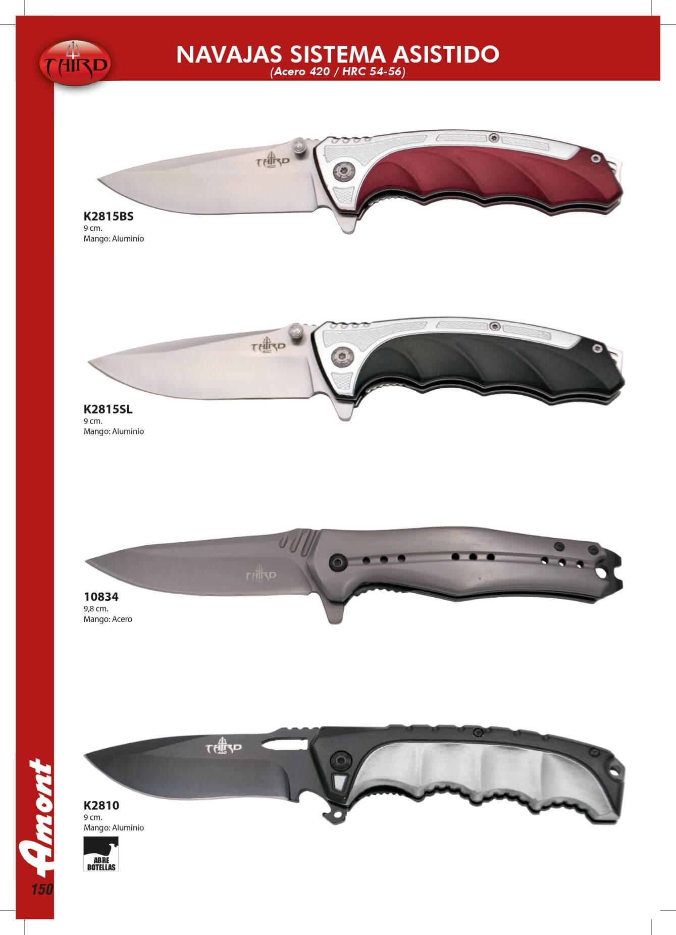 Navajas con sistema de apertura asistido. K2815BS Hoja de 9 cm. Mango: aluminio. K2815SL Hoja: 9 cm. Mango: aluminio. 10834 Hoja: 9.8 cm. Mango: acero. K2810 Hoja: 9 cm. Mango: aluminio. Abrebotellas.