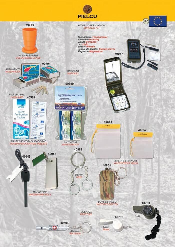 Accesorios de supervivencia, entre los cuales se encuentran dos kits de supervivencia, con artículos como, por ejemplo: espejo de señales, cerillas, vela, kit de costura, brújula, silbato, sierra, magnesio, lápiz, hilo y ganchos, alambre, cuchilla, termómetro o luz.