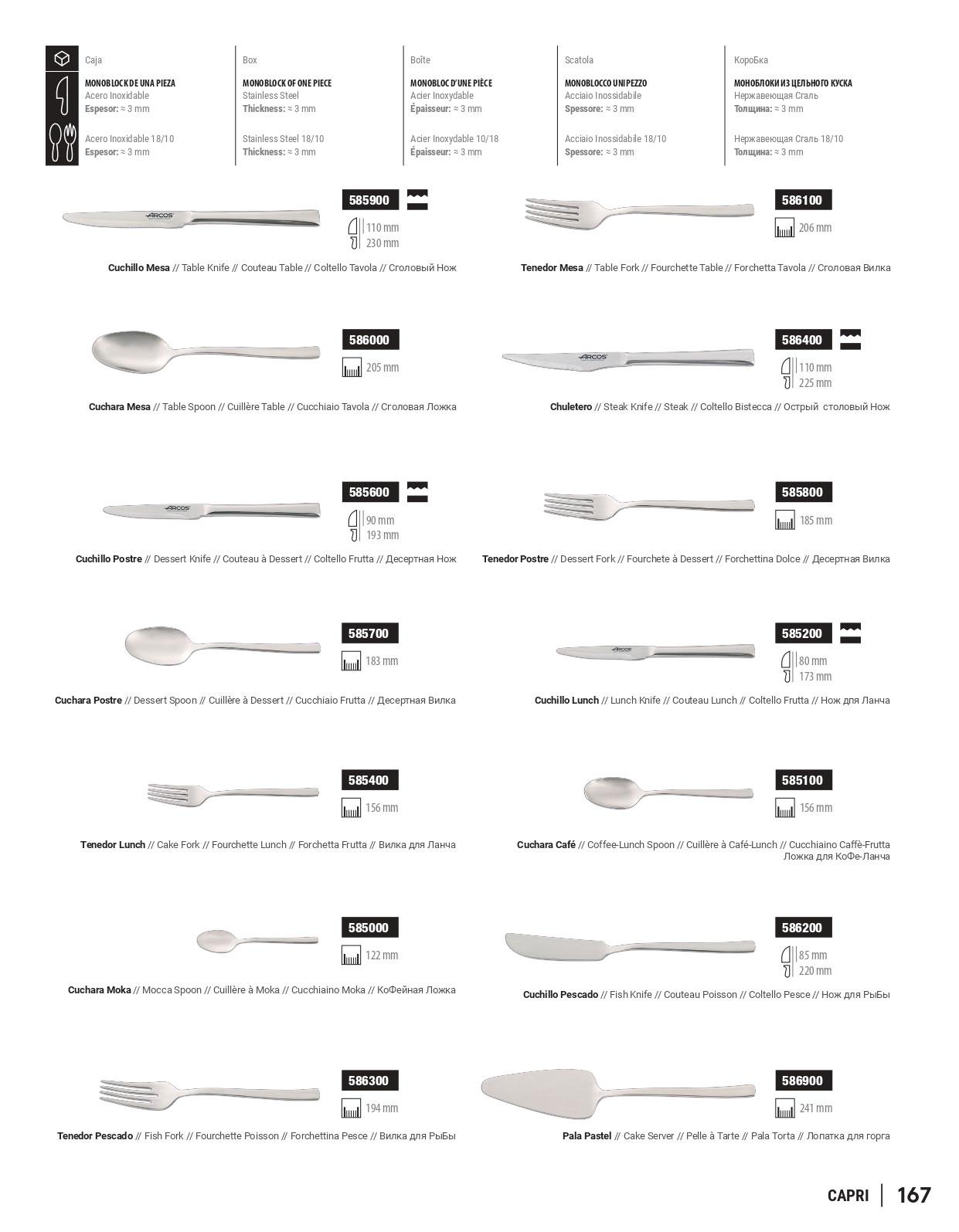 Cubiertos de mesa la serie CAPRI. Con hoja y mango de acero inoxidable 18/10.