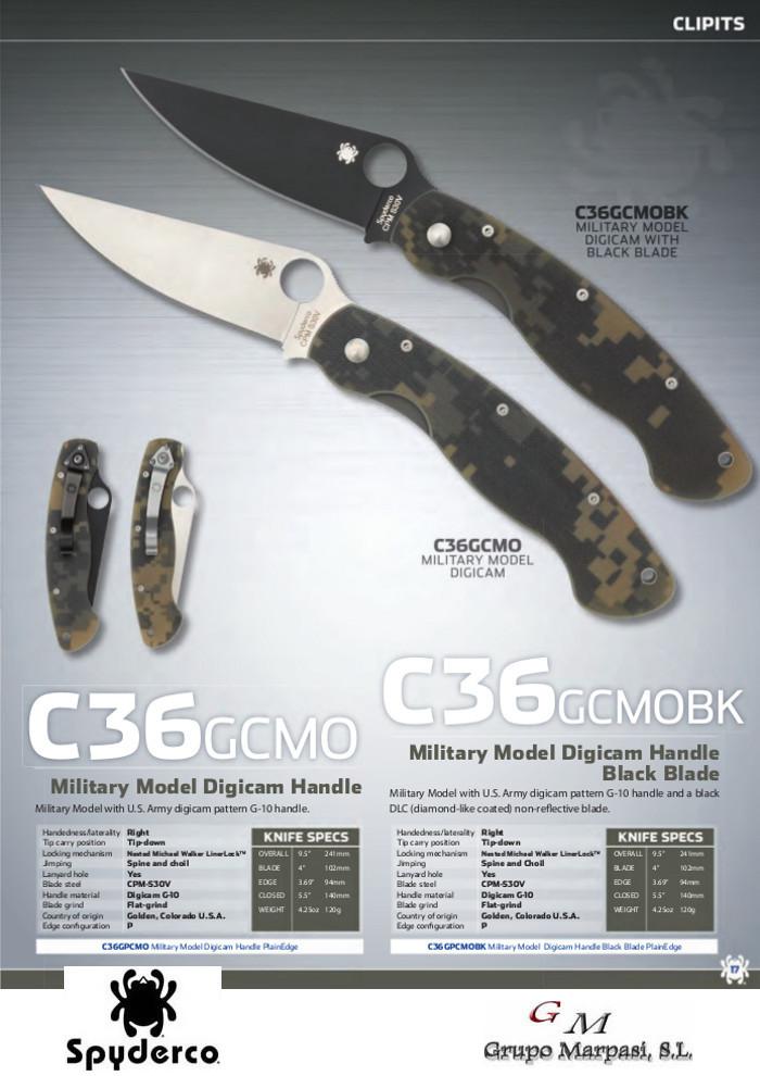 C36GPCMO - Cuchillos modelo militares plegables con camuflaje digital del ejército de los EE.UU mango patrón G-10. Hoja lisa (PlainEdge). C36GPCMOBK - Cuchillos modelo militares plegables con camuflaje digital del ejército de los EE.UU mango patrón G-10. Hoja negra antirreflectante. Hoja lisa (PlainEdge).