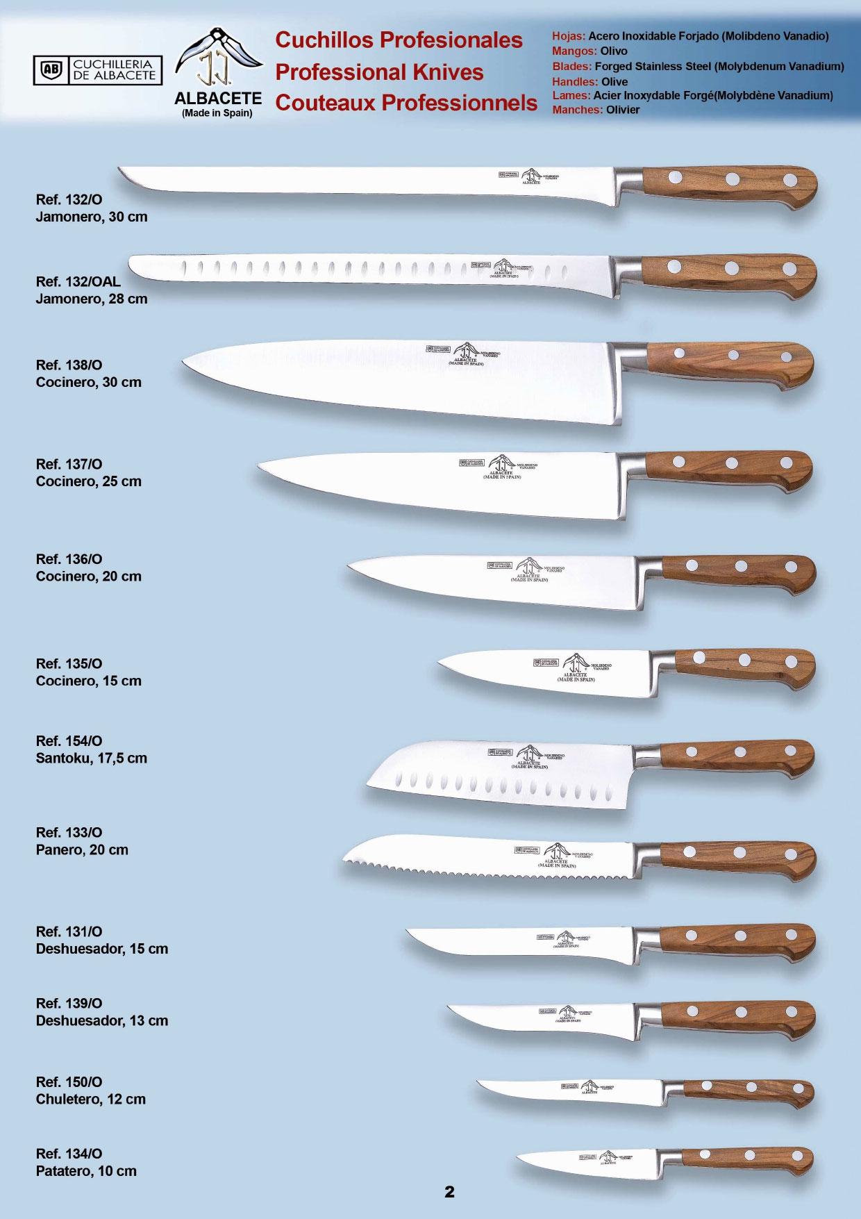 Cuchillos profesionales hoja de acero Molibdeno Vanadio y mango de madera de olivo. Cuchillos jamoneros, cocinero, Santoku, panero, deshuesador, chuletero y patatero.