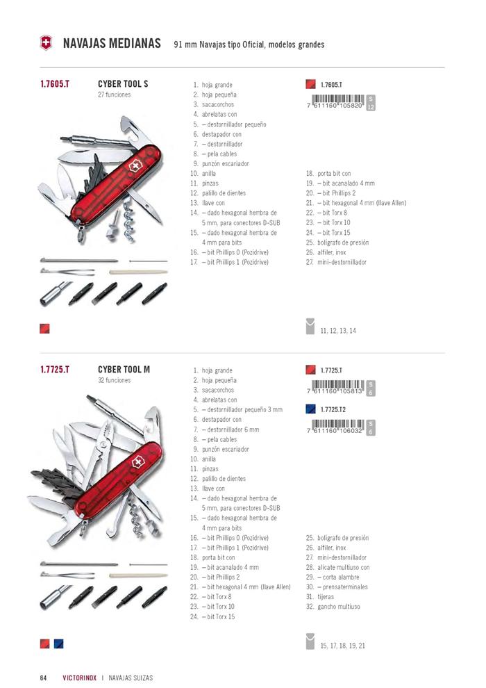 hoja grande, hoja pequeña, sacacorchos, punzón escariador, abrelatas, destornillador 3 mm, destapador, destornillador 6 mm, pela cables, llave, anilla, palillo de dientes, pinzas, mini-destornillador, bolígrafo de presión, alfiler, acero inoxidable, alicate multiuso, corta alambre, prensa terminales, tijeras, gancho multiusos, bit acanalado 4, bit Phillips 2, bit Phillips 0 (Pozidrive), bit Phillips 1 (Pozidrive), bit Torx 10, bit Torx 15, porta bit, dado hexagonal hembra de 5 mm, para conectores D-SUB, dado hexagonal hembra de 4 mm para bits, bit Torx 8, bit Hex 4