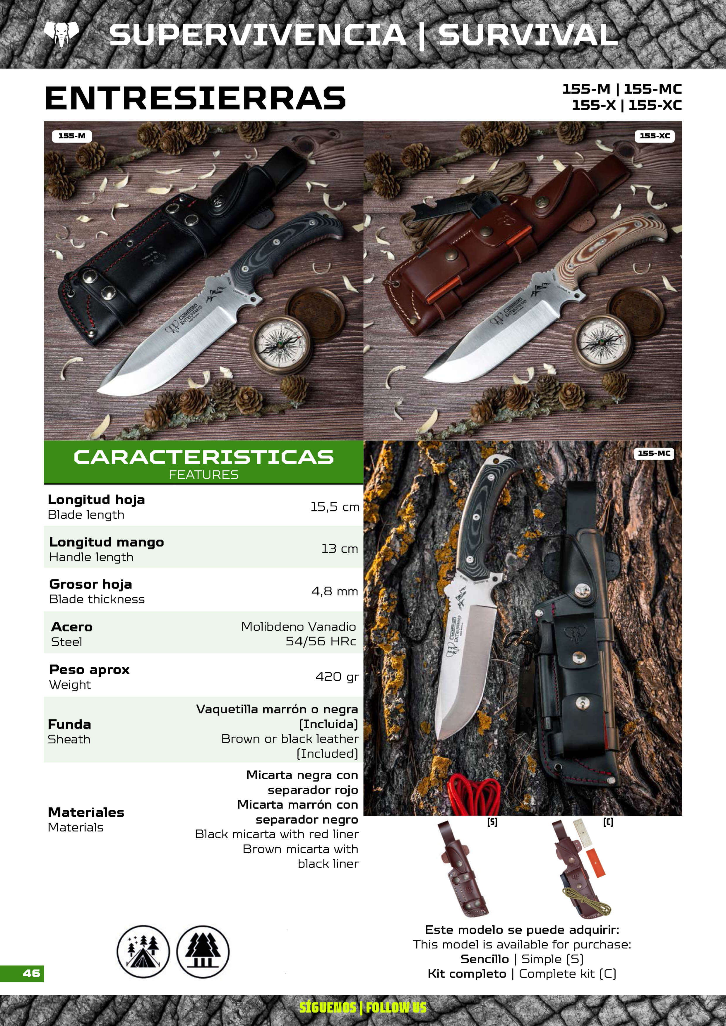 -Hoja de espiga completa, cachas de mikarta negra o marrón con separadores rojos, en acero MoVa de alta dureza y resistencia. -Incluye funda de cuero, vaina simple.