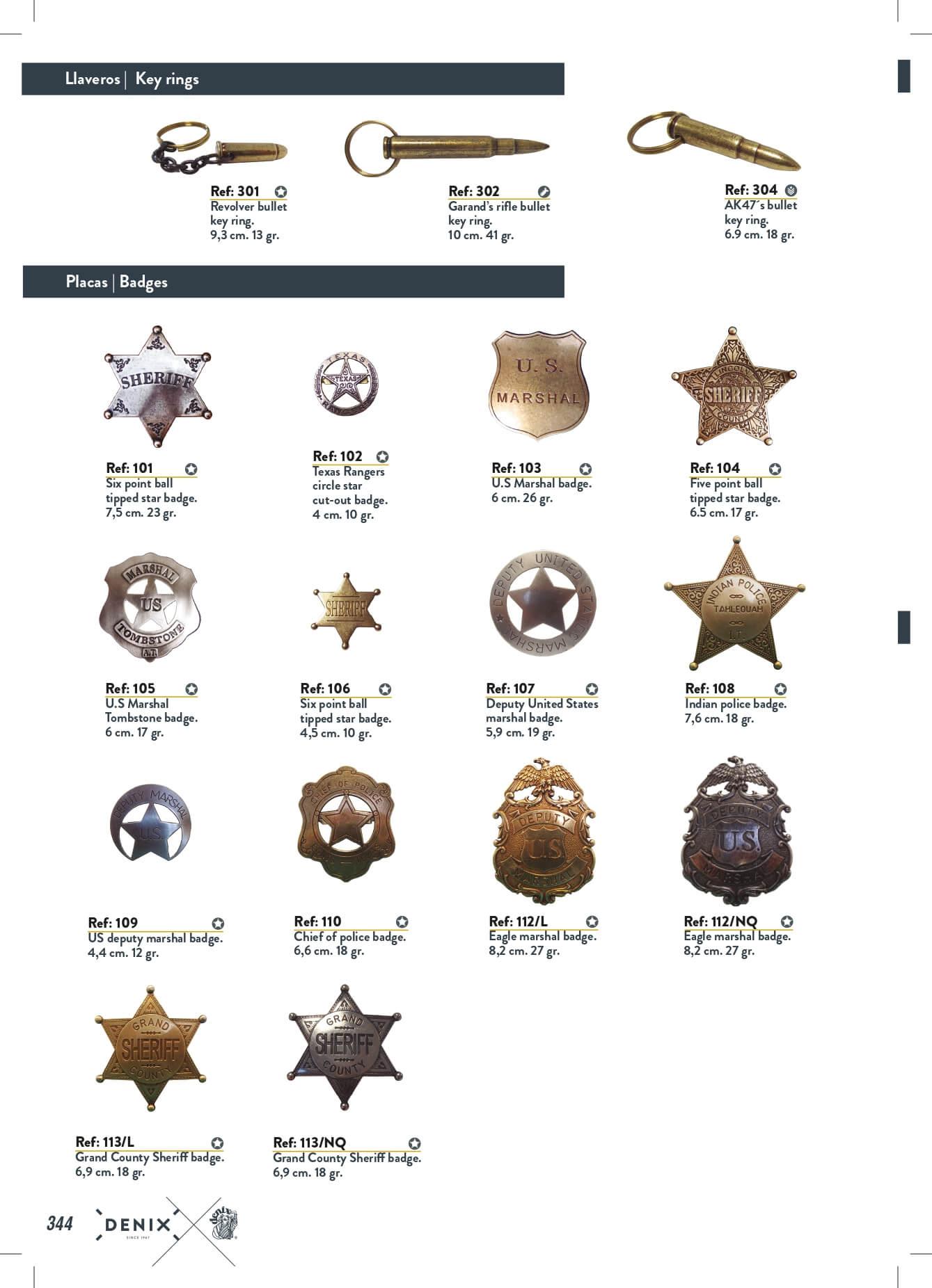 Llaveros de balas, placas de policia y U.S. Marshal y estrellas de sheriff.