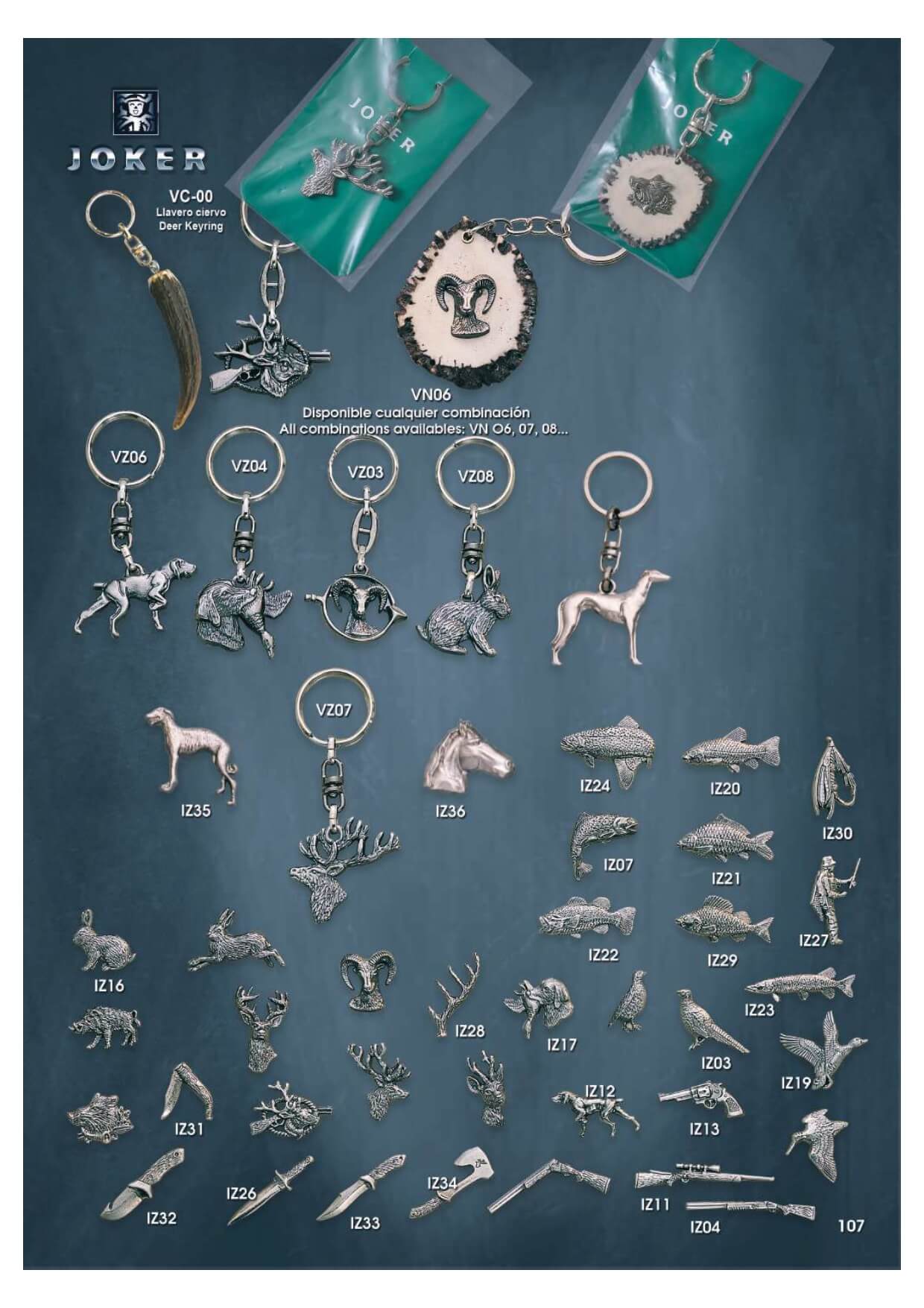 Llaveros y pines con motivos de caza.