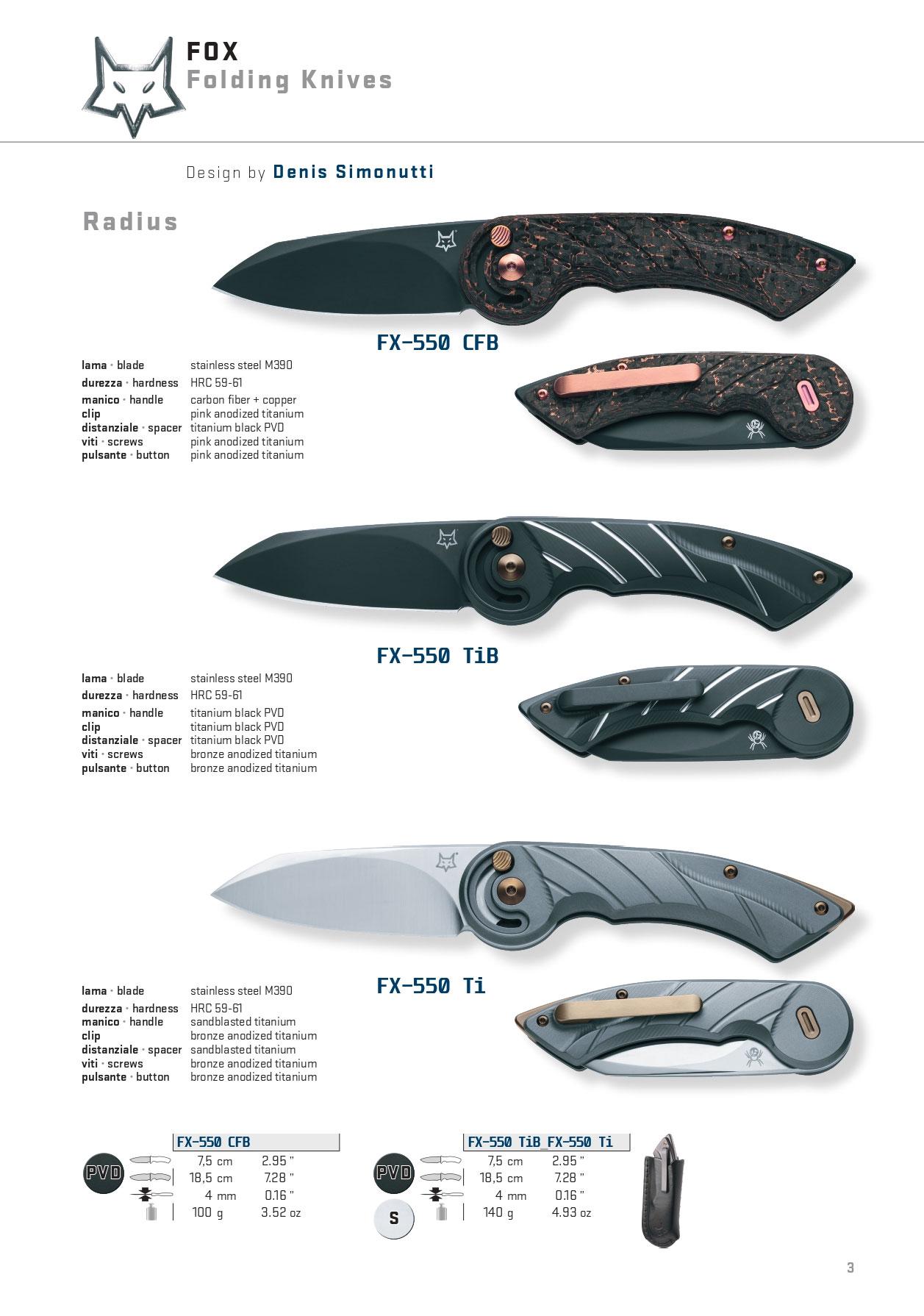 Navajas de supervivencia Fox Radius, diseñadas por Denis Simonutti. Hoja de acero M390 con una dureza de 59-61 HRC. Largo de hoja: 7,5 cm, longitud abierta 18,5 cm, grosor de hoja 4 mm. Peso 100 gr.