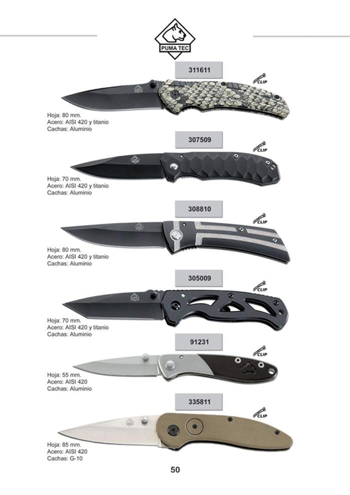 Navajas tácticas con mango de sándalo y acero, G-10 o aluminio lacado, con alpaca o bicolor y hoja de acero AISI 420.