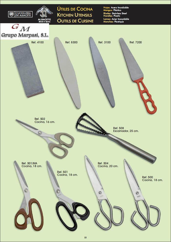 Utensilios de cocina: tijeras, escamador y afiladores.