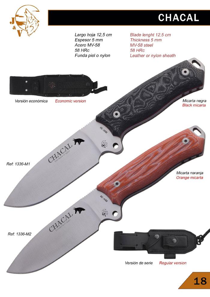 Cuchillo enterizo con cachas de micarta naranja o negra. Hoja de acero MV-58 de 12.5 cm. Longitud total: 25 cm. Ancho de pala: 3.5 cm. Grosor de hoja: 5 mm. Disponible en dos versiones: