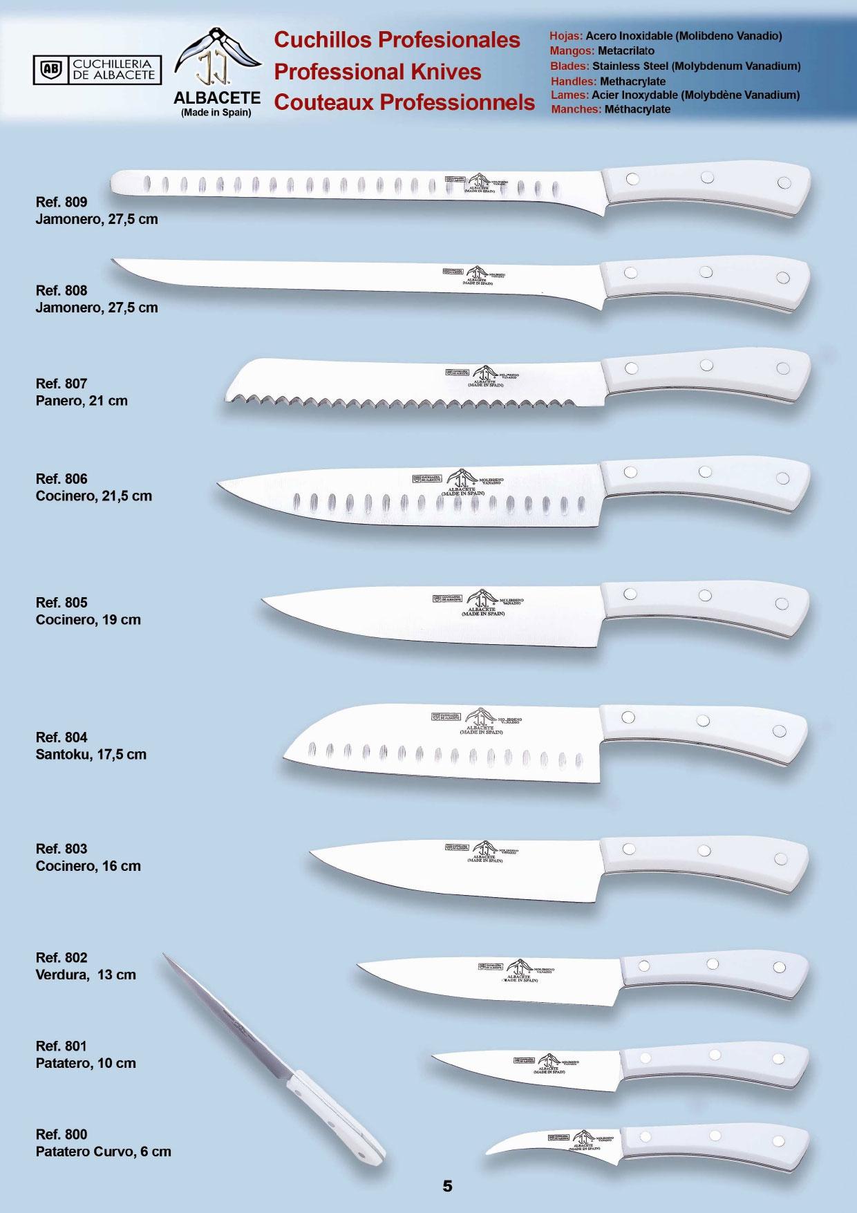 Professional JJ knives with Molybdenum Vanadium steel blade and methacrylate handle. Slicing knives, bread, chef, santoku, vegetable, potato and curved potato knives.