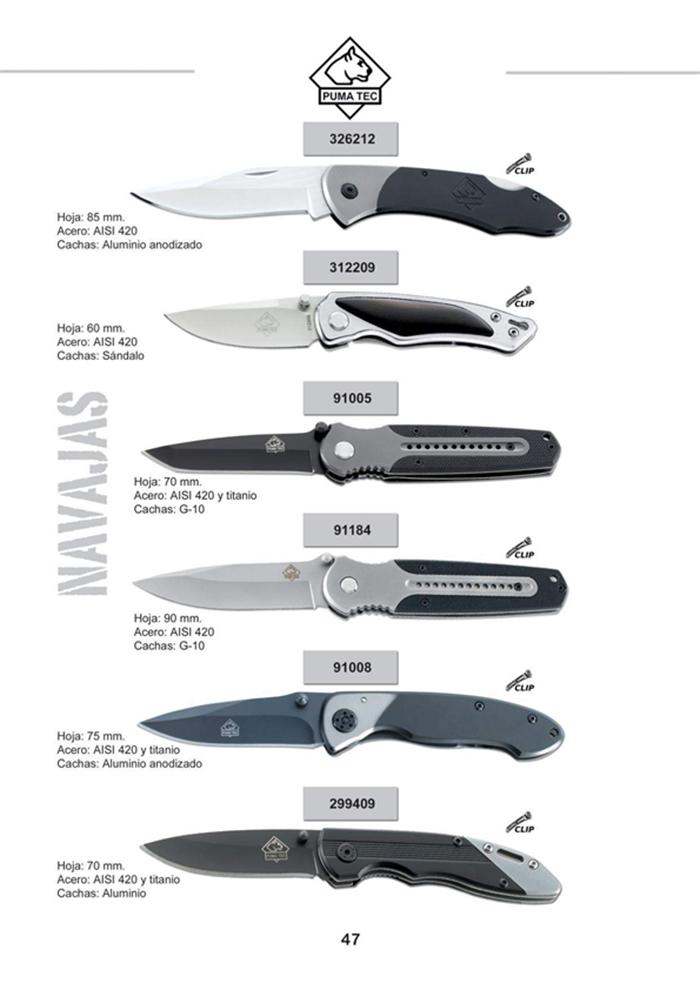 Pocket knives with handle G-10 or aluminum and AISI 420 steel blade.