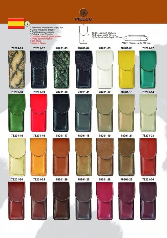 . Knife sheaths, with top grain leather. Press button closure, belt strap and are made in Spain. Dimensions: height 130 mm, width: 58mm, depth: 28 mm.