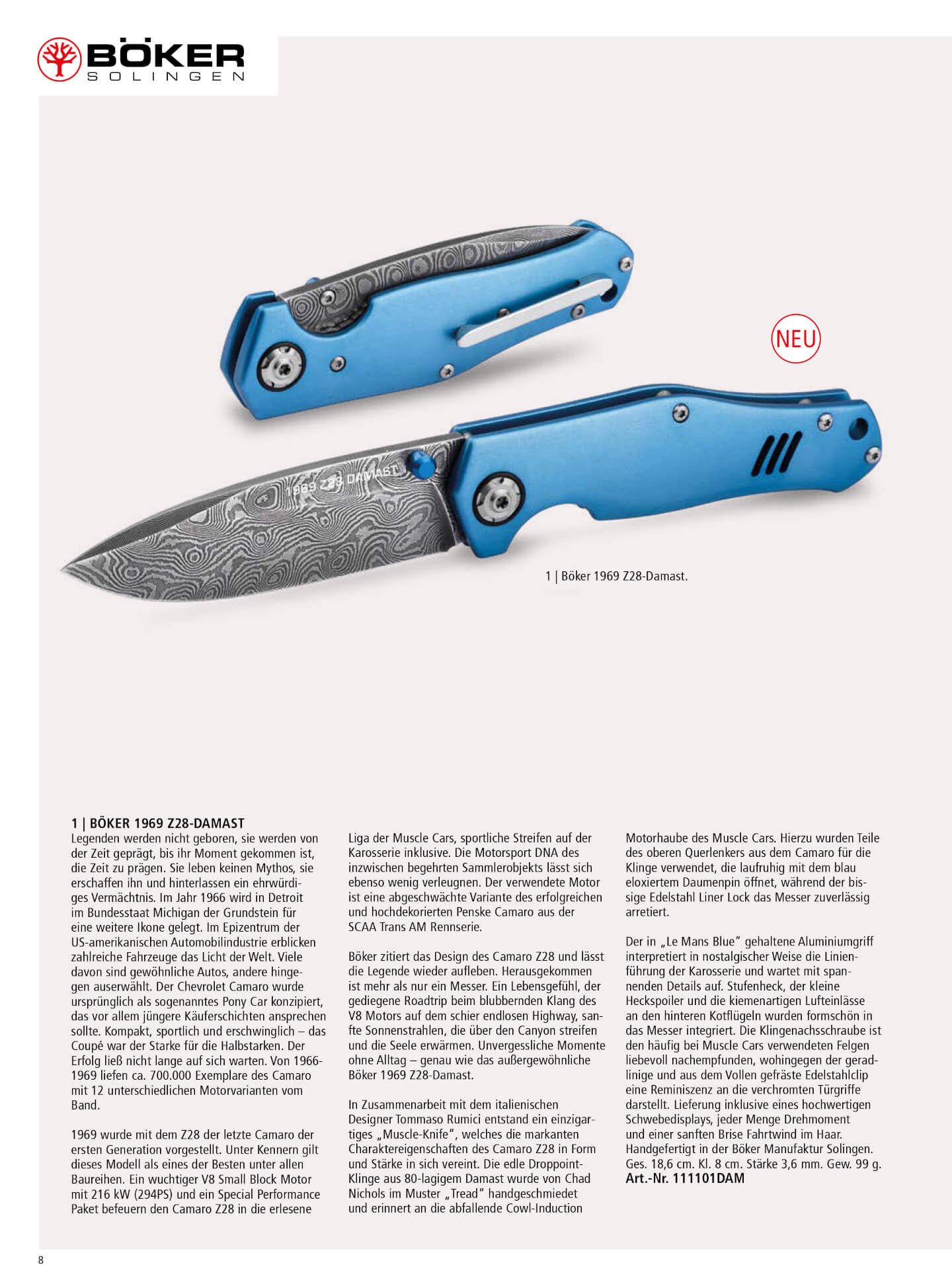 Le couteau damassé Boker 1969 Z28, est une version collector saisissante inspirée de la célèbre Chevrolet Camaro.
