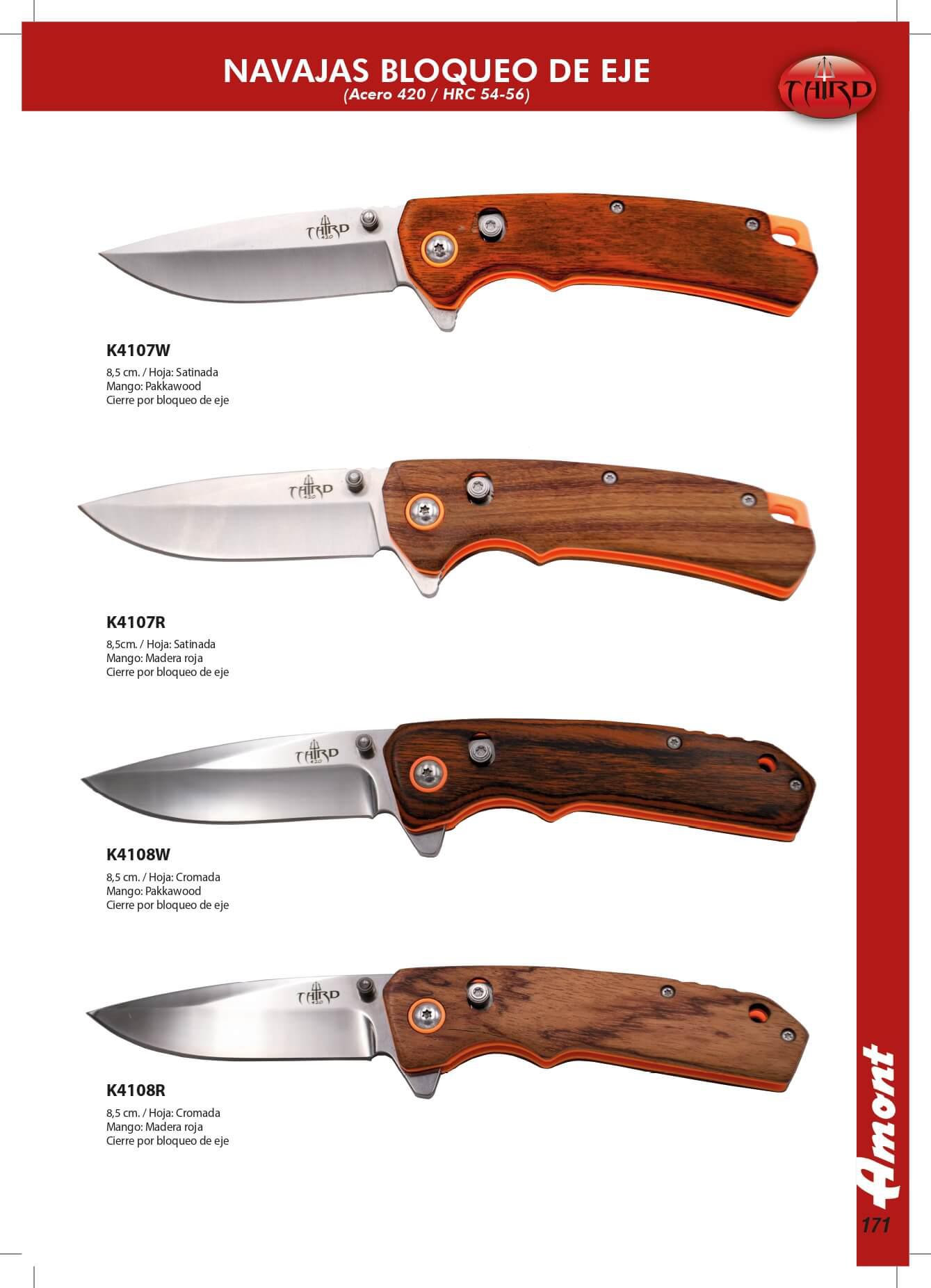 - K4107 : Couteau de poche assisté avec manche en bois avec doublures orange, lame en acier inoxydable de 8,5 cm avec finition satinée, fermeture à verrou de tige. Épaisseur de la lame : 2,75 mm. Coupe cm : 8,3 cm. Longueur du manche : 11,4 cm. Longueur totale : 19,9 cm. Poids : 105 grammes.