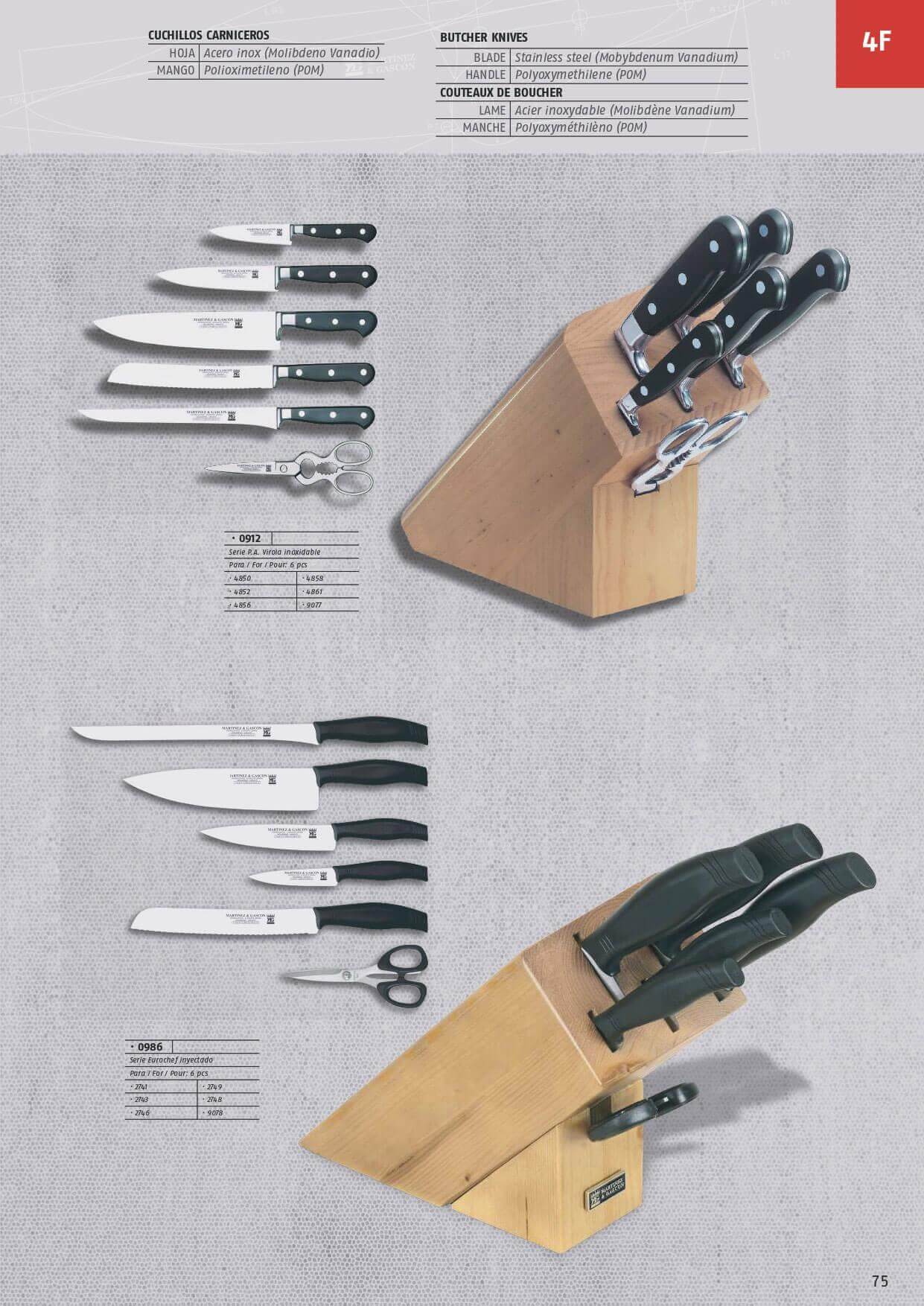 Il comprend 6 pièces: ciseaux, couteau à jambon (29 cm), chefs de 15 et 22,5 cm, couteau à pain et dentelle.