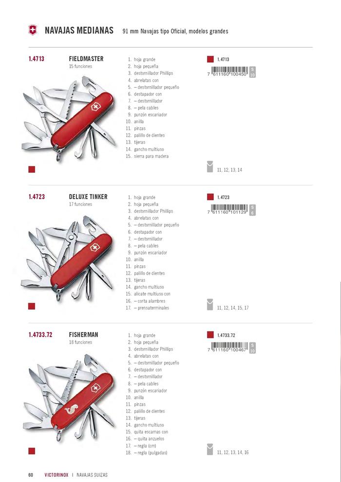 grande lame, petite lame, ouvre-boîte, tournevis 3 mm, décapsuleur, tournevis 6 mm, pince à dénuder, poinçon alésoir, tournevis Phillips 1/2, ciseaux, scie à bois, crochet multifonction, cure-dent, pince à épiler, anneau.
