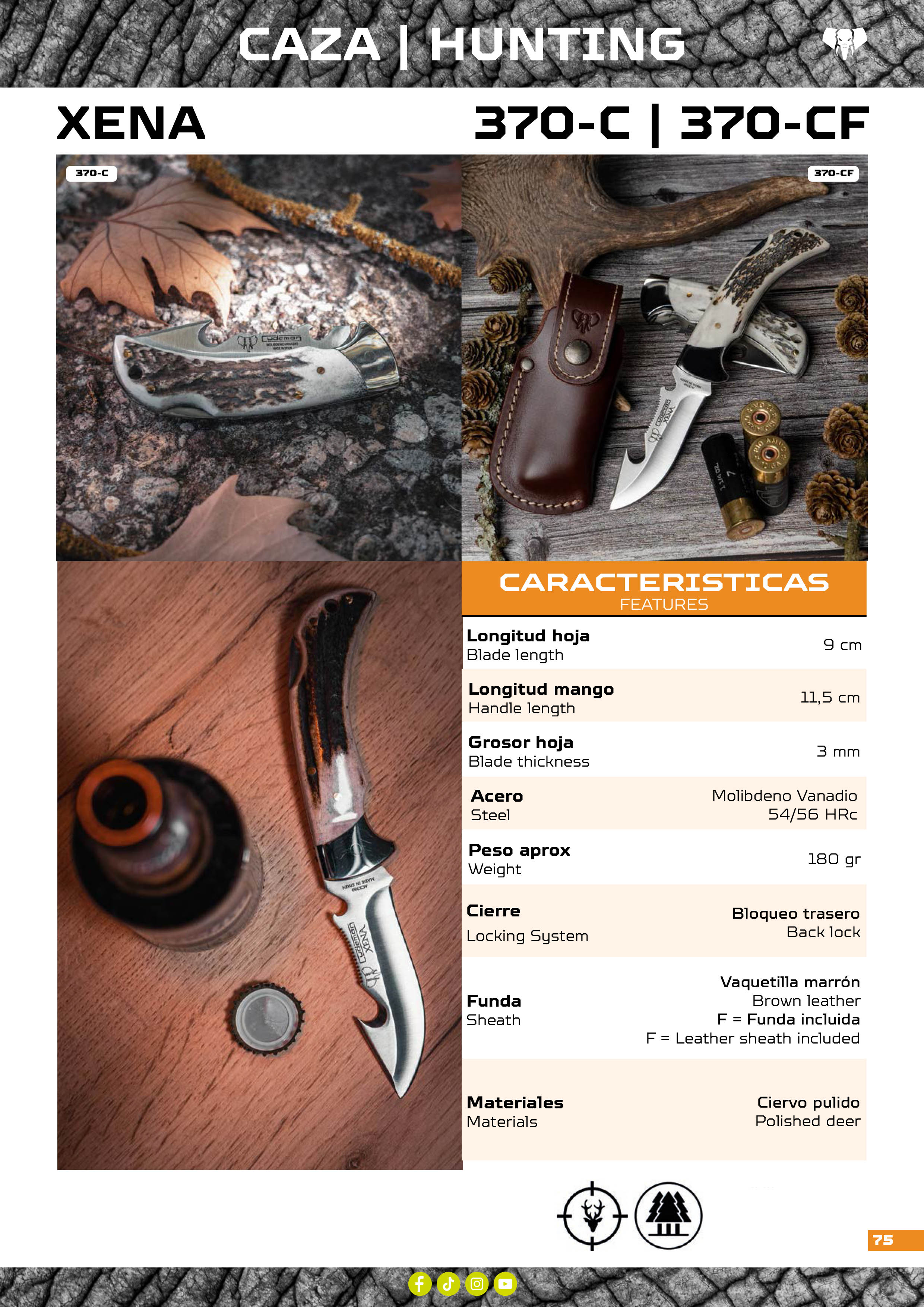 Canivetes de caça com lâmina de aço molibdênio vanádio e suporte de aço A-304, com sistema de travamento traseiro. Cabos de madeira de oliveira, chifre de veado ou chifre de touro.