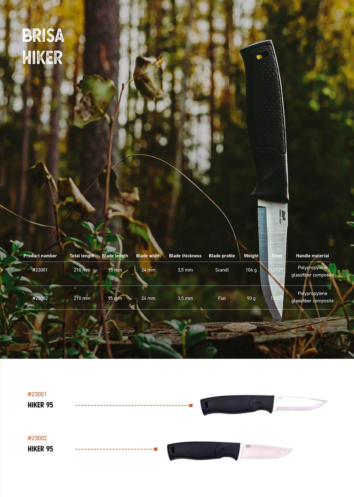 Hiker 95 é uma faca projetada com inspiração finlandesa e escandinava. Faz parte de uma gama de produtos focada em caminhantes, campistas, bushcrafters, pequenos caçadores e famílias.