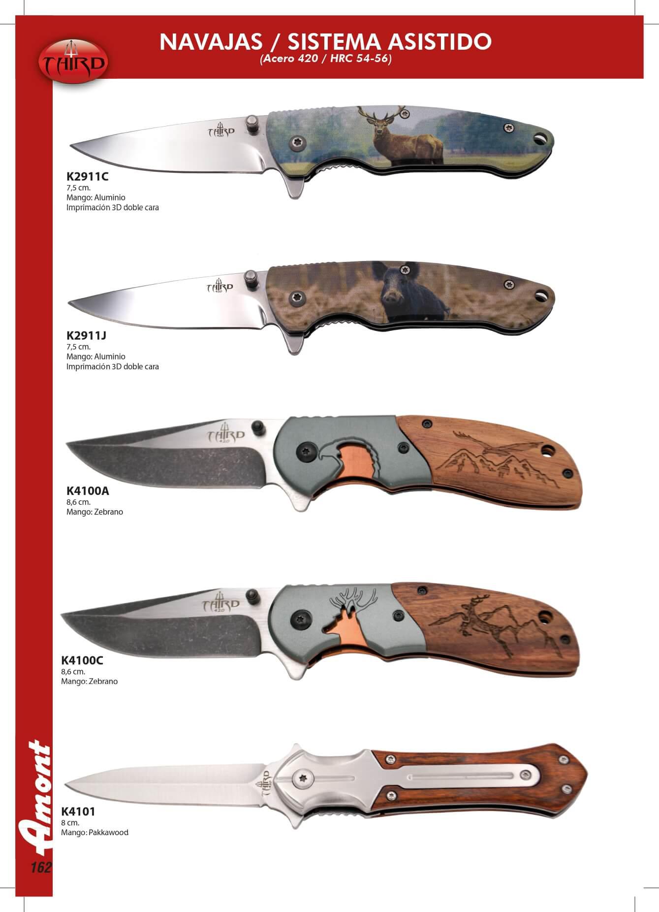 Facas com sistema de abertura assistida. Folha de aço 420. K4100A Alça: Zebrano. Folha: 8,6 cm. K4100C Alça: Zebrano. Folha: 8,6 cm. K4101 Alça: Pakkawood. Folha: 8 cm