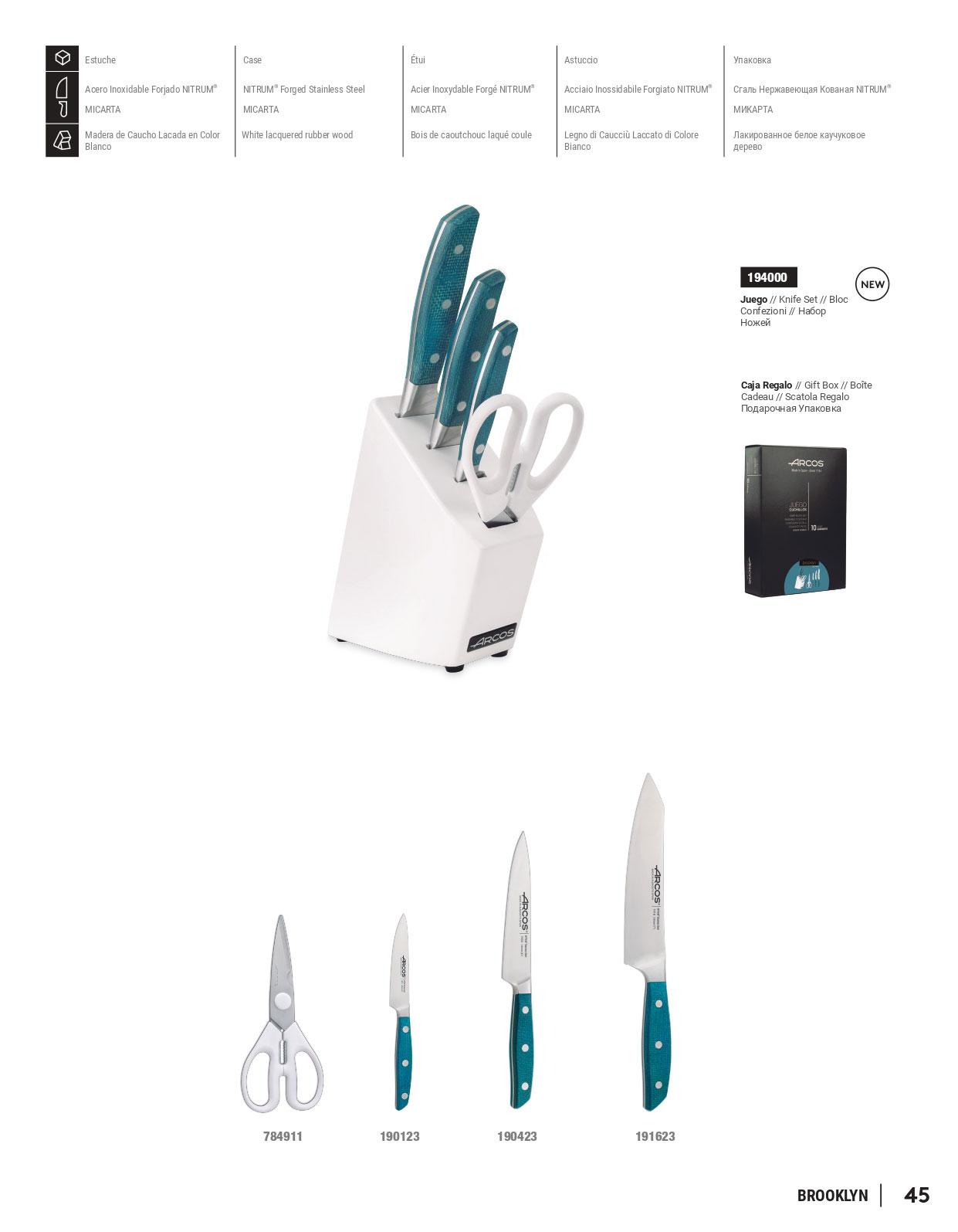 Lâminas forjadas em aço NITRUM e alças micarta. Bloco de madeira em borracha lacada branca. Inclui: rocking santoku de Lâmina de 19 cm, faca chef de lâmina de 15 cm, faca de lâmina de 10 cm e tesoura de cozinha de 19,5 cm com cabo de polipropileno branco.