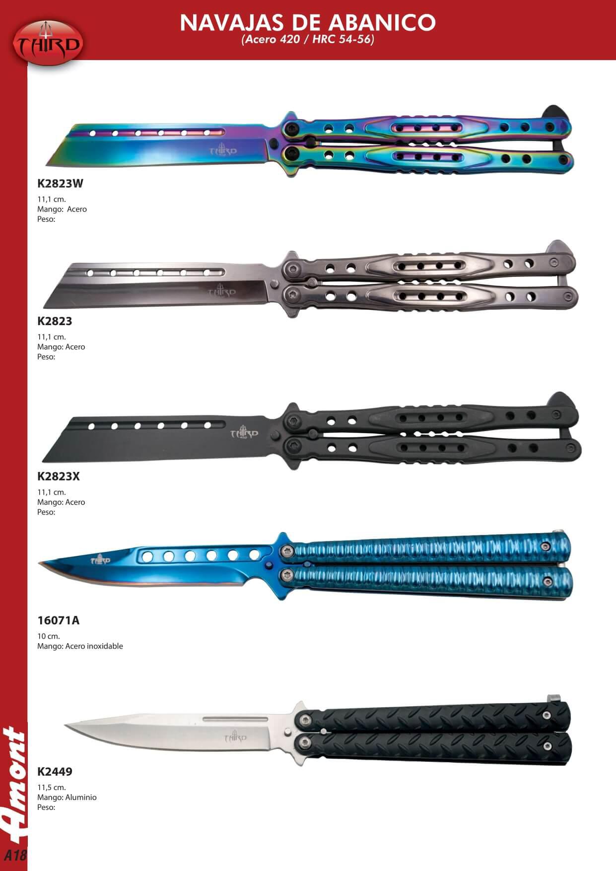Facas de borboleta com lâmina de aço 420 e cabo de aço inoxidável ou alumínio.