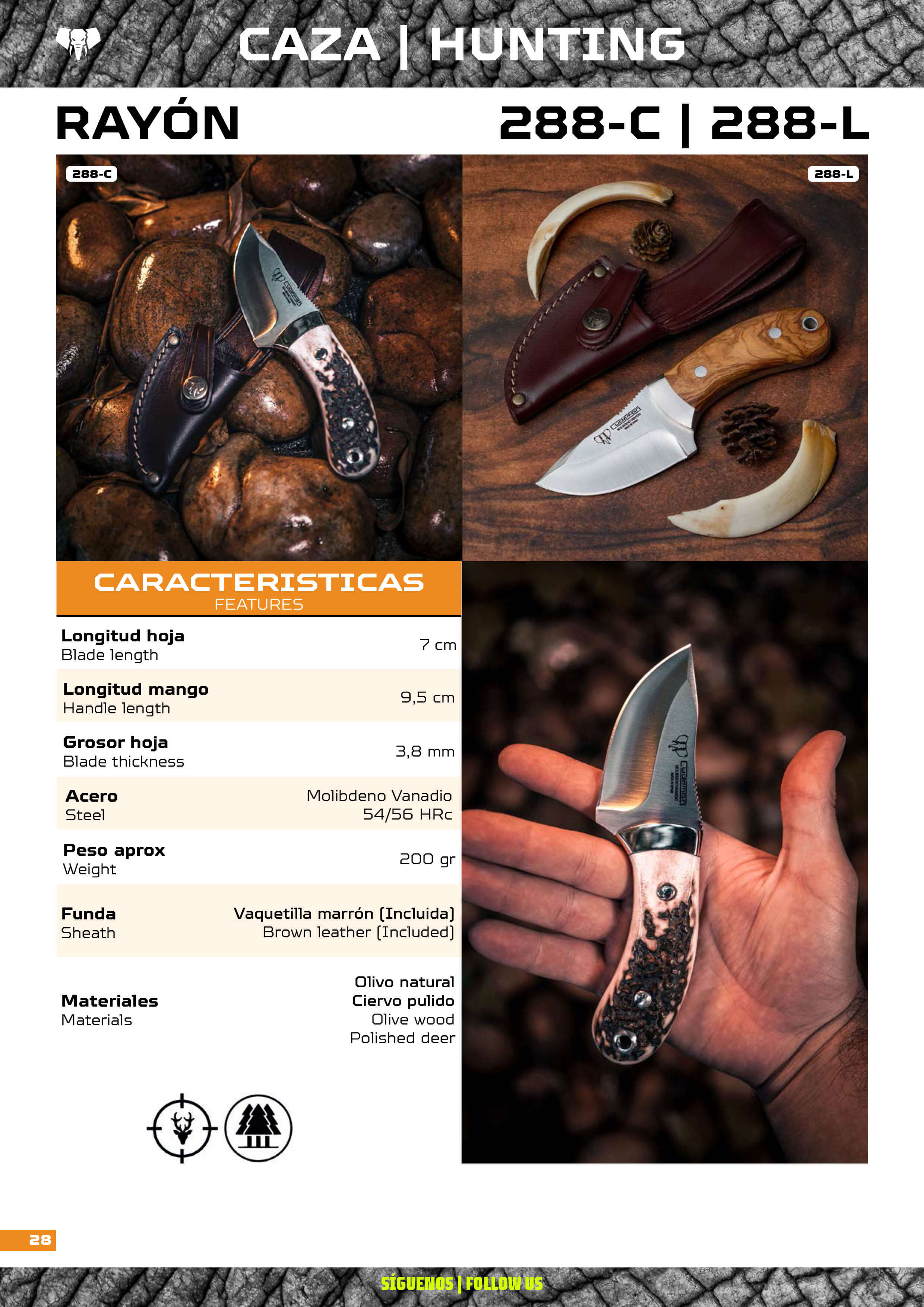 288: Comprimento da lâmina: 7,5 cm. Comprimento total: 17 cm. Espessura da lâmina: 4 mm, largura da lâmina: 4 cm. Folha com esvaziamento côncavo. Estojo em couro incluído.