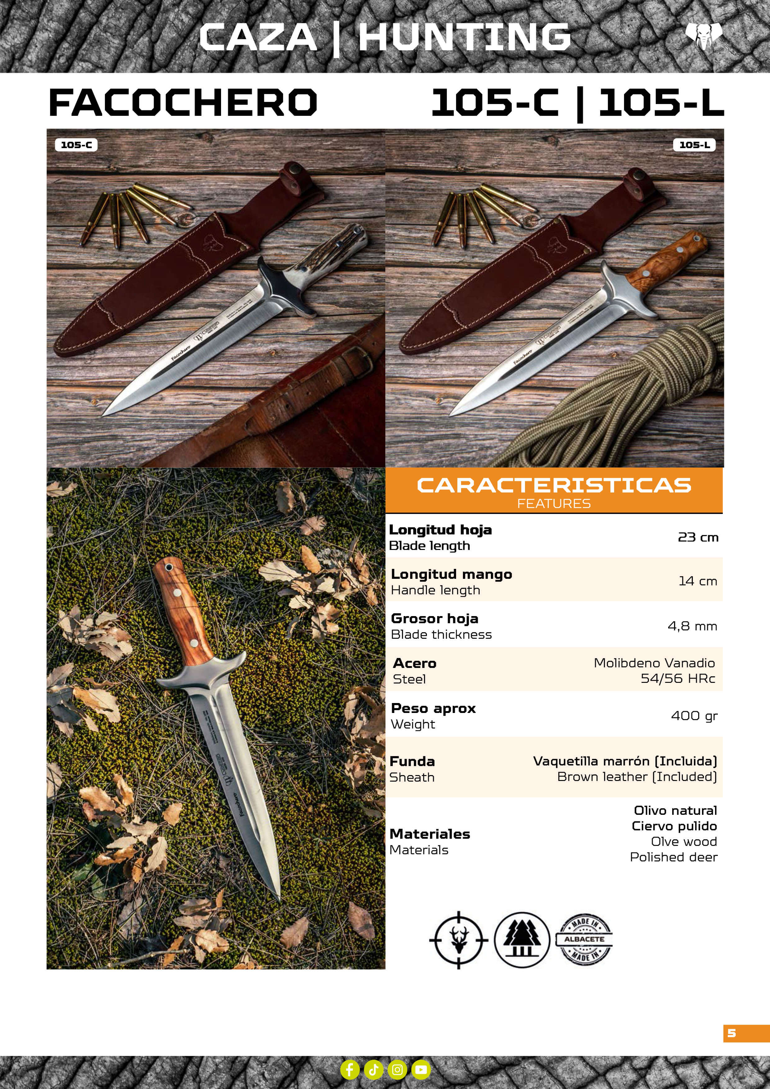 Cabo de 14 cm em chifre de veado ou madeira de oliveira , com cruzeta em aço inoxidável 420 acetinado. Comprimento total 36,5 cm.