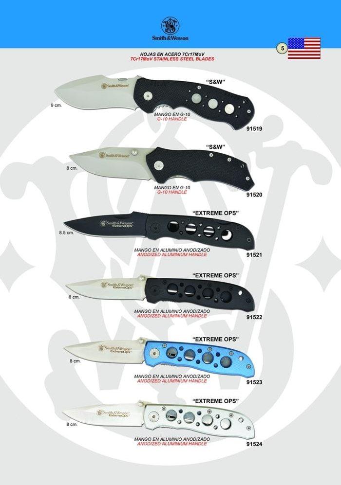 Facas com lâminas de aço 7Cr17MoV e alça de alumínio anodizado.