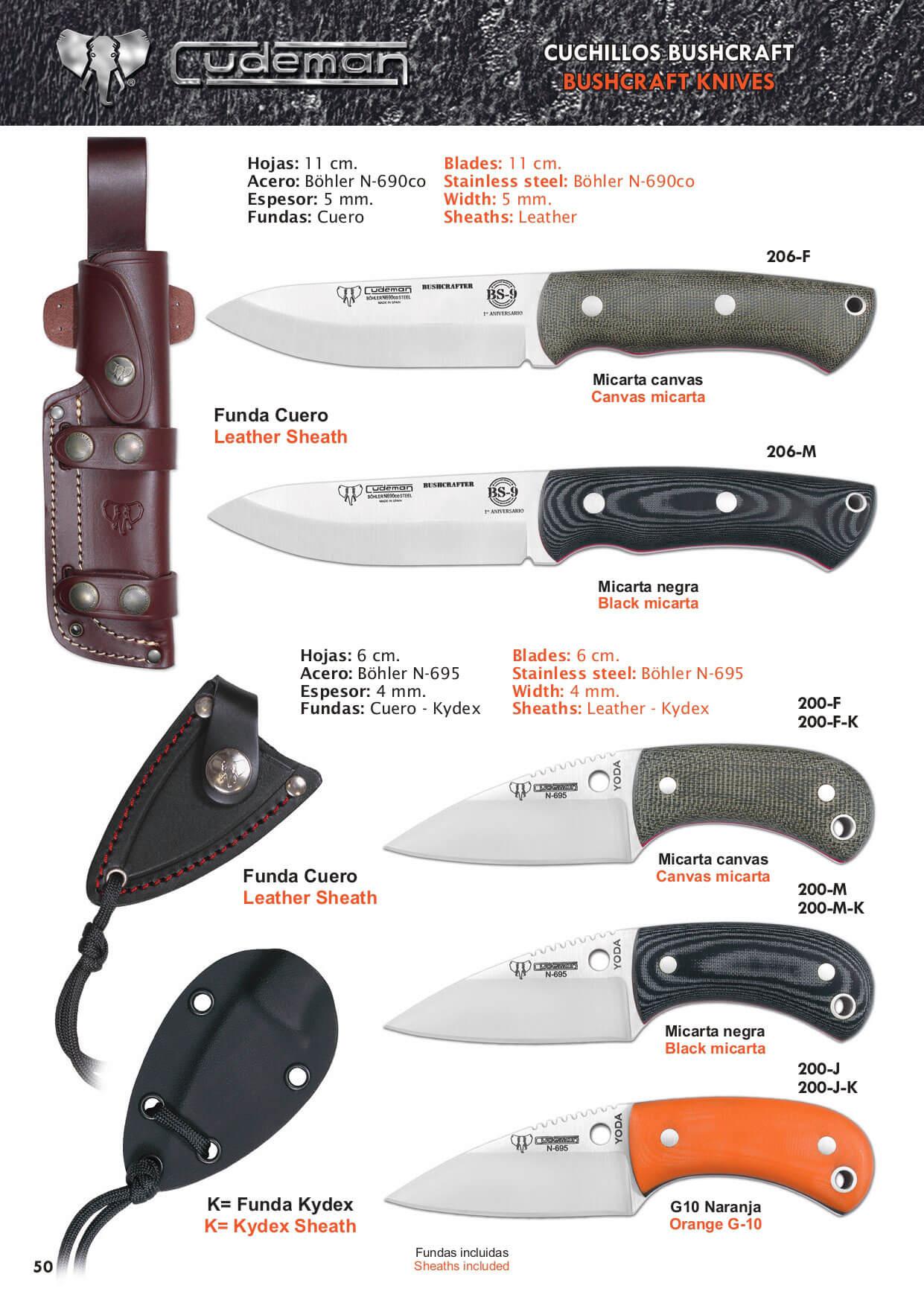Facas Yoda de Cudeman, com lâmina de 6 cm de comprimento de aço BÖHLER N-695 com retificação plana e espessura de 4 mm. Comprimento total de 11,8 cm