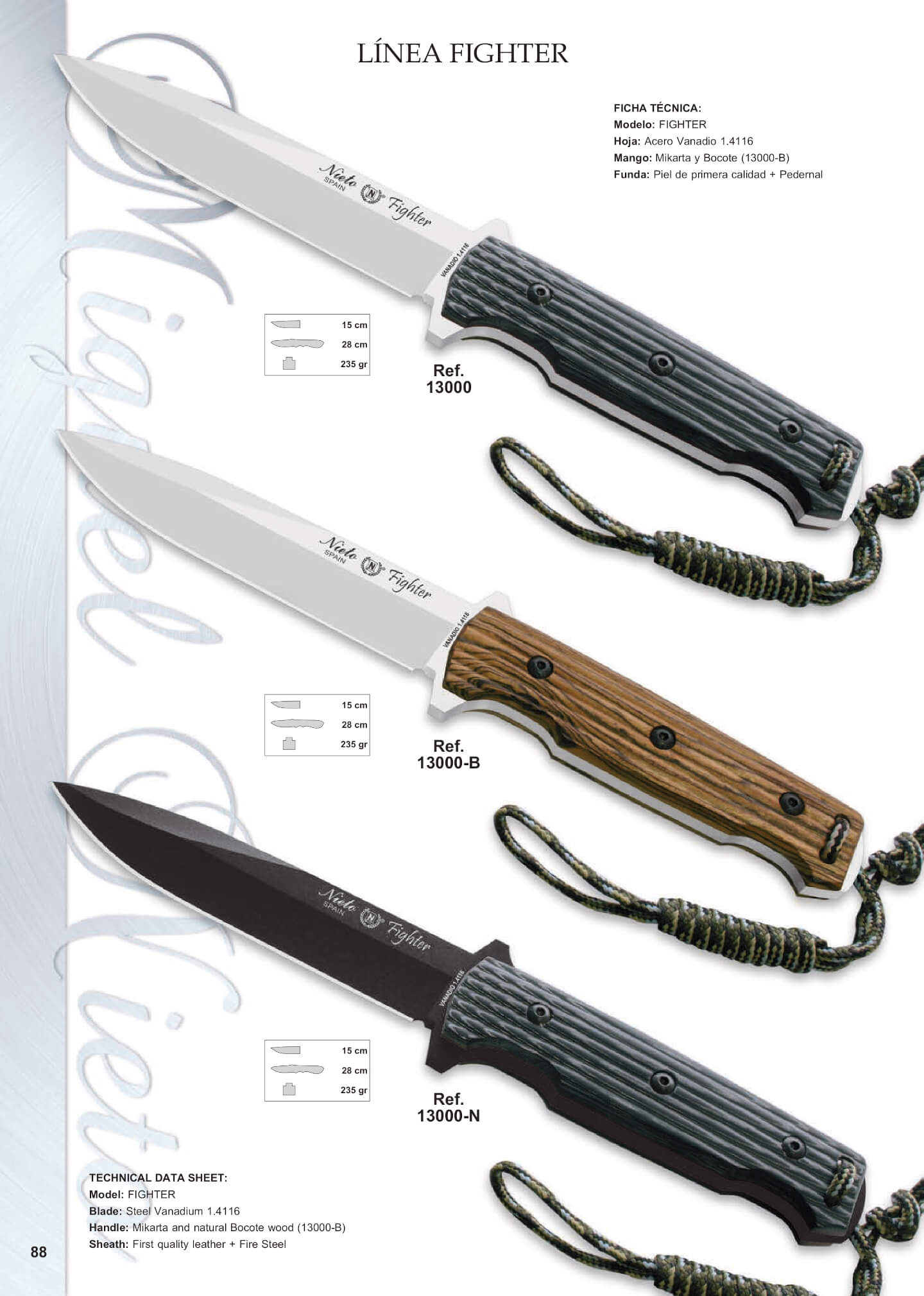 Facas inteiriças de aço vanádio 1.4116 com lâmina de 15 cm. Comprimento total 28 cm. Inclui bainha de couro de qualidade premium e pederneira. Peso: 235 gr.