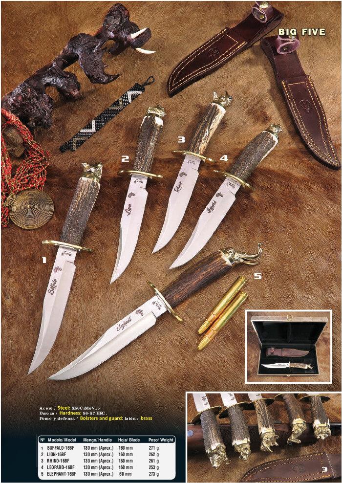 As características comuns dessas facas são a lâmina de aço X50CrMoV15 de dureza 56-57 HRC e cabo de chifre de veado com alça de latão. Eles incluem uma bainha de couro marrom e uma caixa de apresentação.