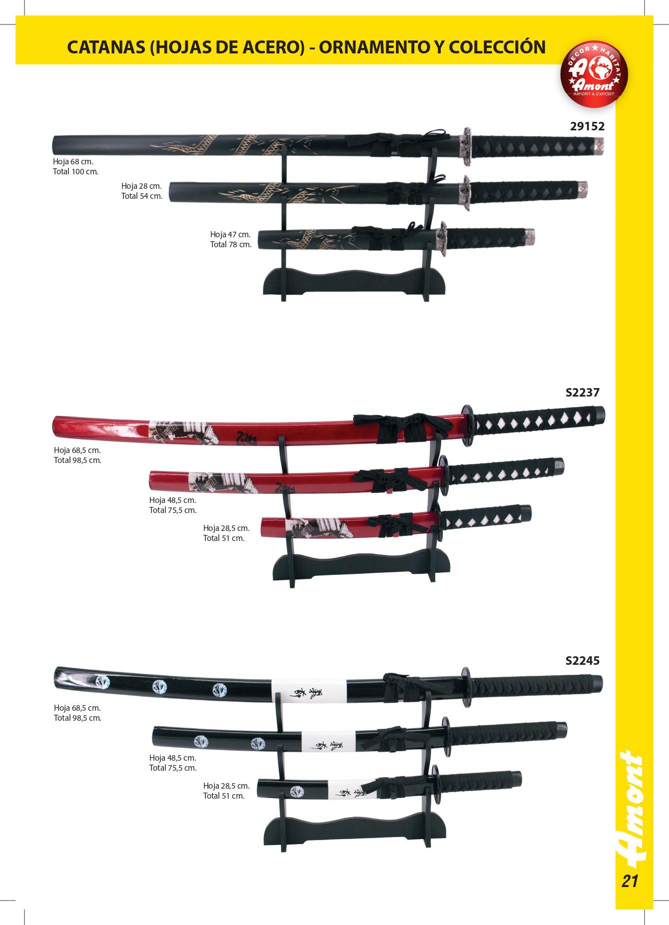 Katanas samurai com lâmina de aço para ornamento e coleção. 29152 Conjunto de três katanas pretas. S2237 Conjunto de três katanas vermelhas. S2245 Conjunto de três katanas preto e branco.
