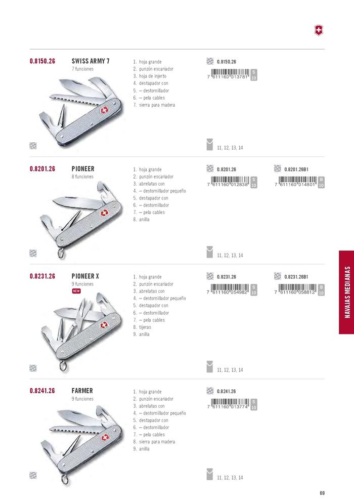 lâmina grande, tesoura, furador, abridor de latas, chave de fenda de 3 mm, abridor de garrafa, chave de fenda de 7,5 mm, descascador de fios, anel.