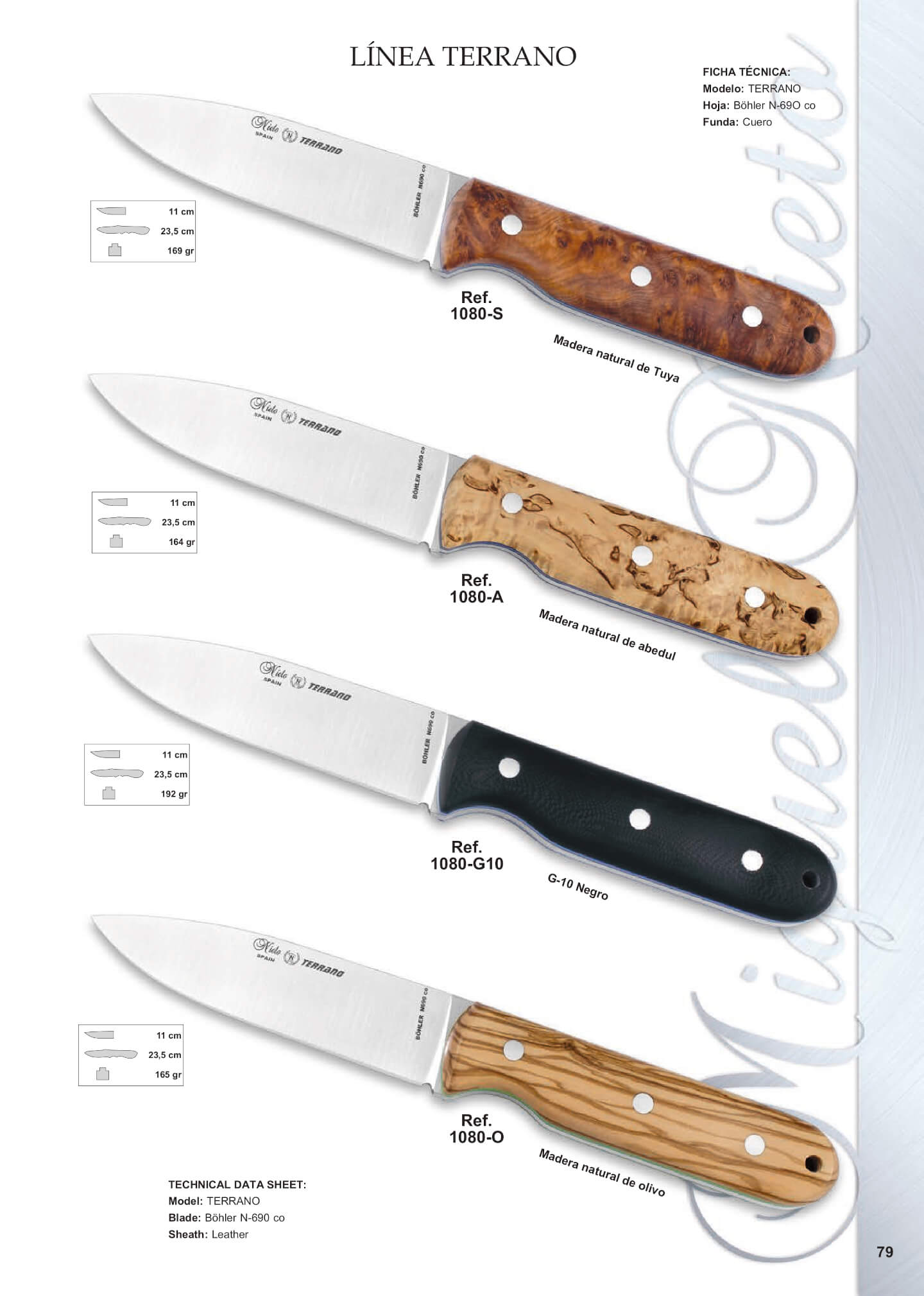 Comprimento total: 23,5 cm. Comprimento da folha: 11 cm. Espessura da folha: 4,4 mm.