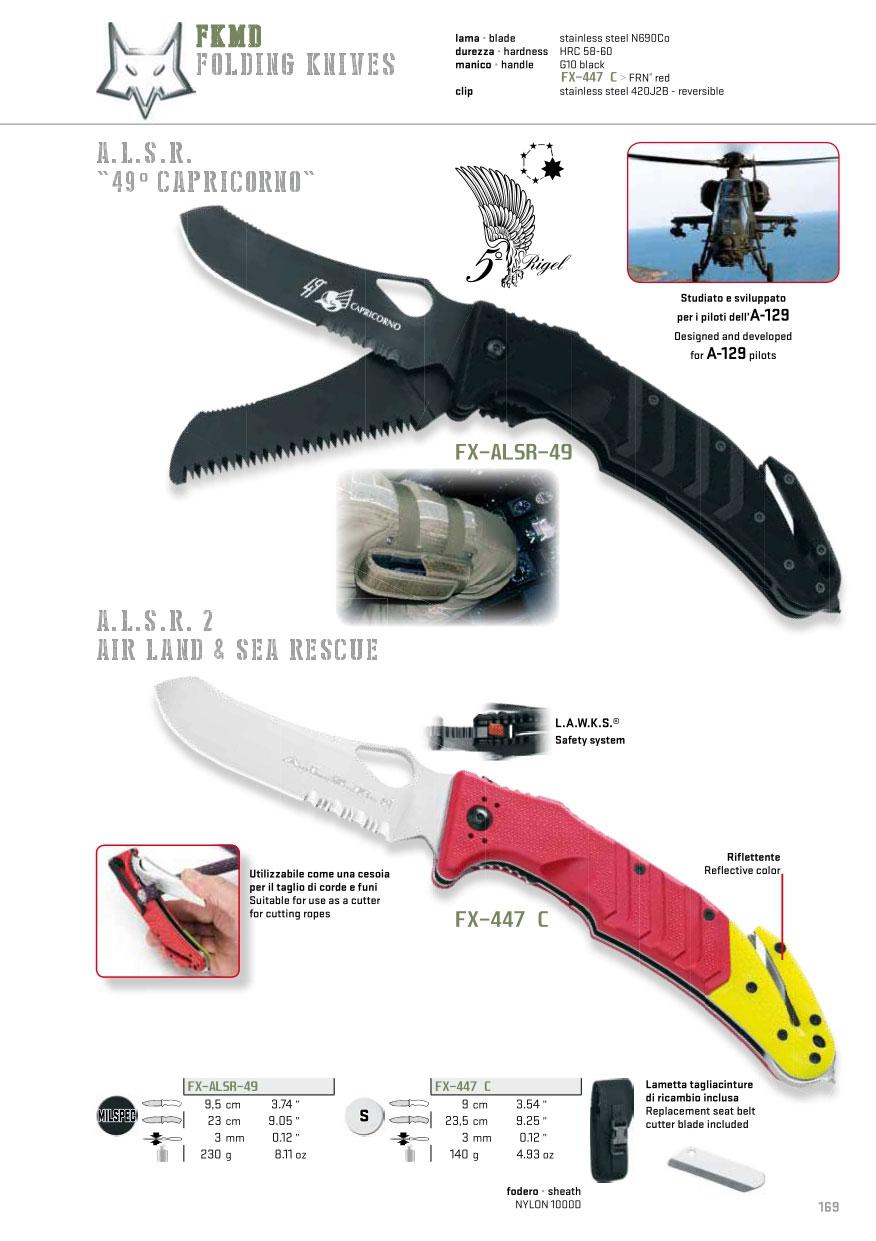 Navajas de rescate con hoja de acero N690Co, con dureza HRC 58-60. Clip de acero 420J2B reversible.