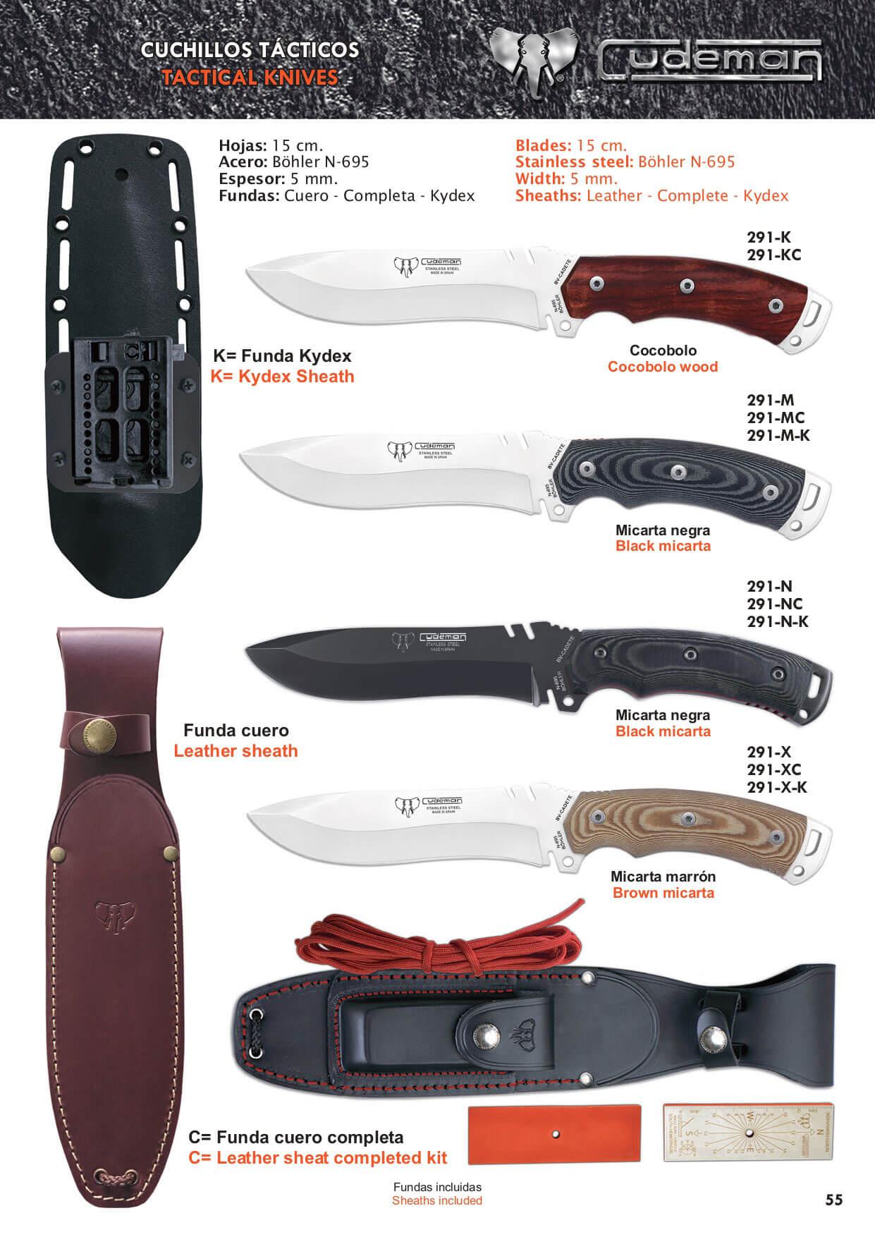 Cuchillos enterizos con cachas de mikarta de distintos colores o madera de cocobolo. Fabricado con acero Böhler N-695 de dureza 59-61. Con agujero ara cordón fiador. Punta rompe cristales. Cremallera en el canto para un mejor agarre. Corta alambres. Encapsulador de balas.