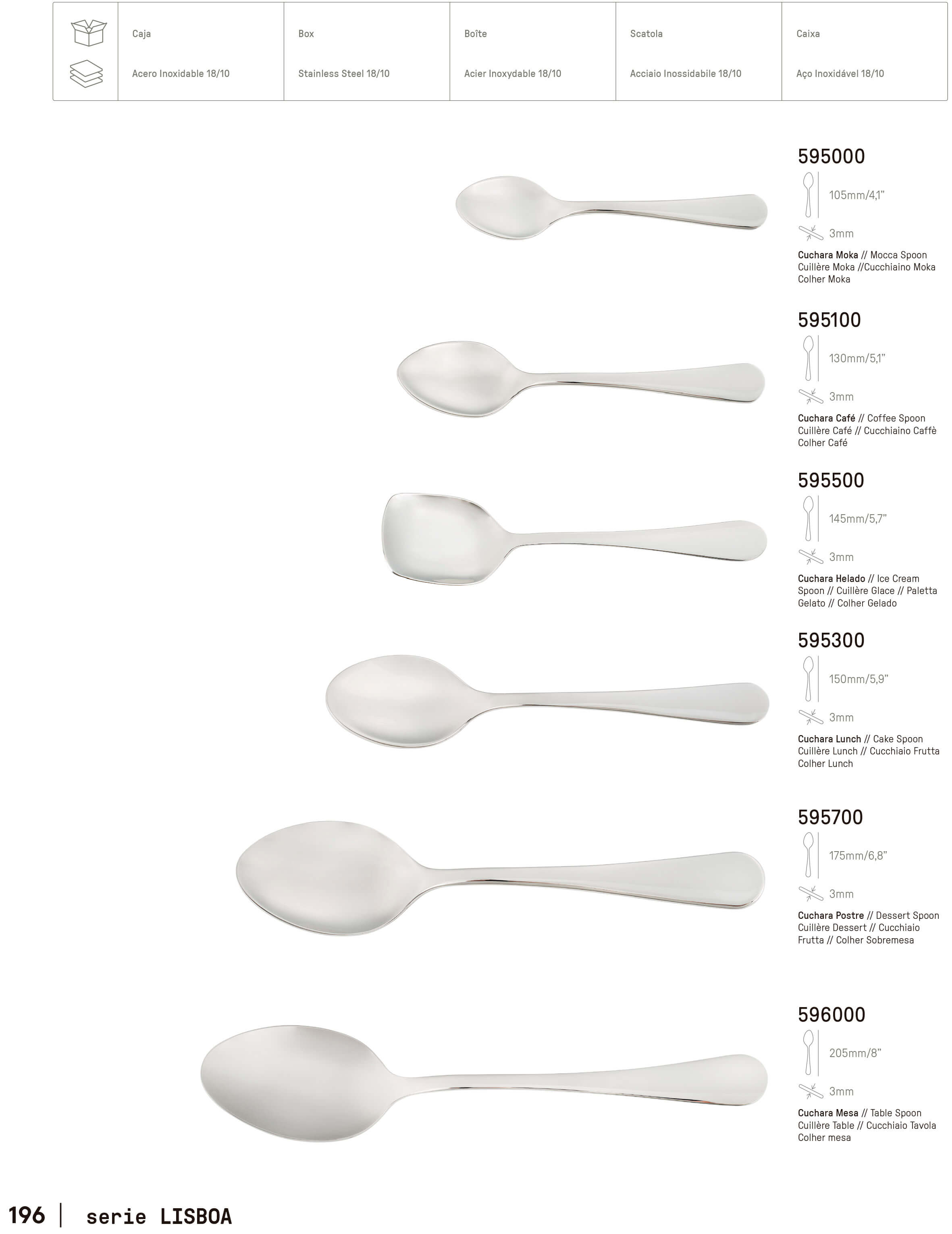 En esta serie se incluyen diferentes tipos de cuchillos, de cucharas y de tenedores. También, cuenta con pala de pastel, con tenedor para ensalada y para servir. Además de un estuche de 24 piezas y un maletín de 113 piezas.