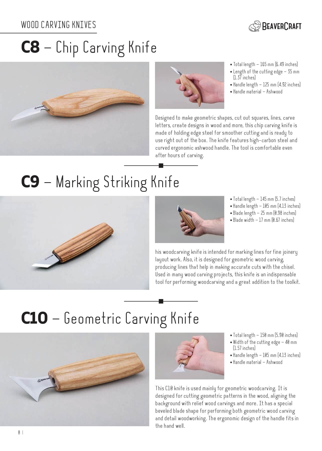 Cuchillos de tallar con hoja de acero y con mango de madera de fresno revestido con aceite de linaza. Estos cuchillos están especialmente diseñados para hacer formas geométricas. Estas herramientas están preparadas para utilizarse nada más salir de la caja. Estos cuchillos son cómodos incluso tras largo periodo tallando.