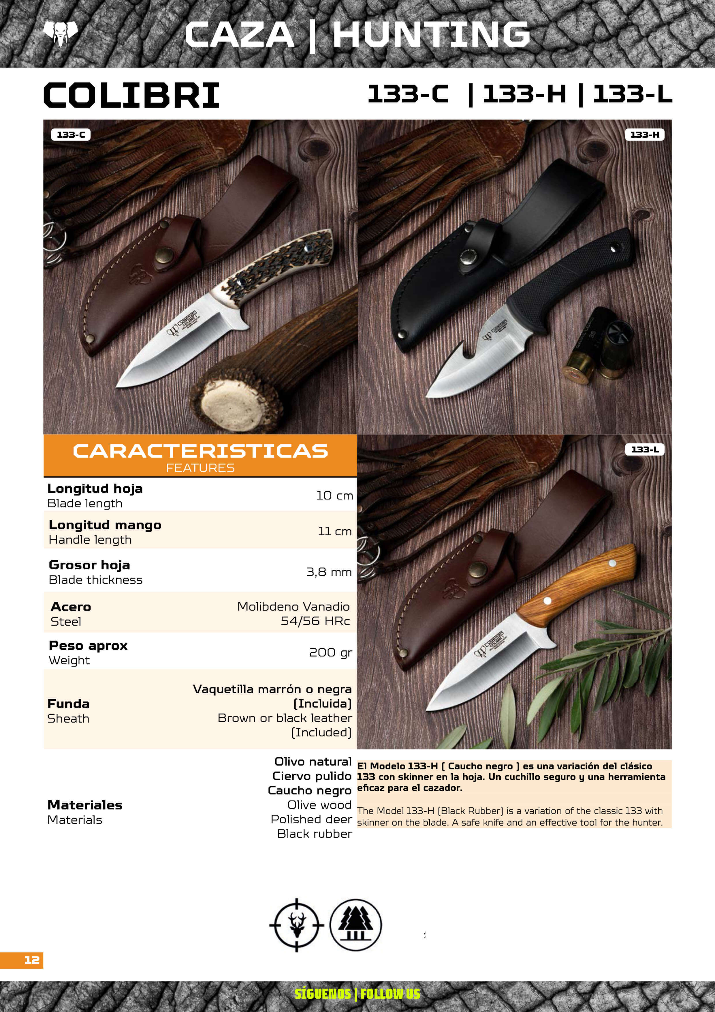 133: Cuchillo enterizo con hoja de acero Molibdeno vanadio. Longitud de hoja: 10 cm, longitud total: 21 cm. Grosor de la hoja: 3.8 mm. Ancho de pala 3.5 cm. Hoja con vaciado cóncavo y punta drop-point. Funda de cuero marrón incluida.