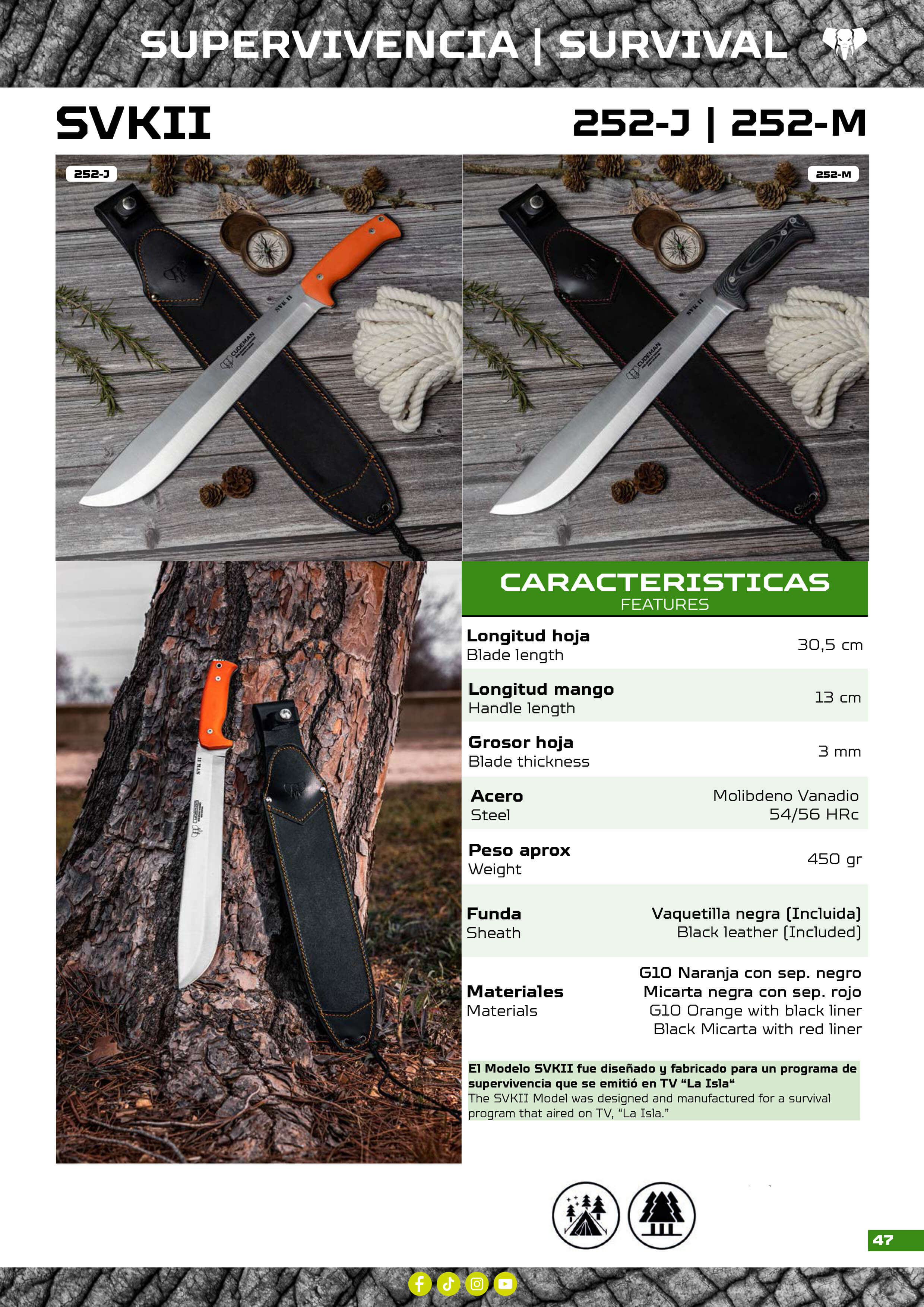 Machetes de supervivencia y aventura SVK II con acero MOVA y cachas en micarta negra o G-10 naranja, con funda de cuero incluida.