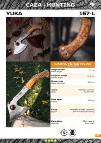 Hacha de caza de 21cm de hoja y mango de madera de olivo. Incluye funda marrón.