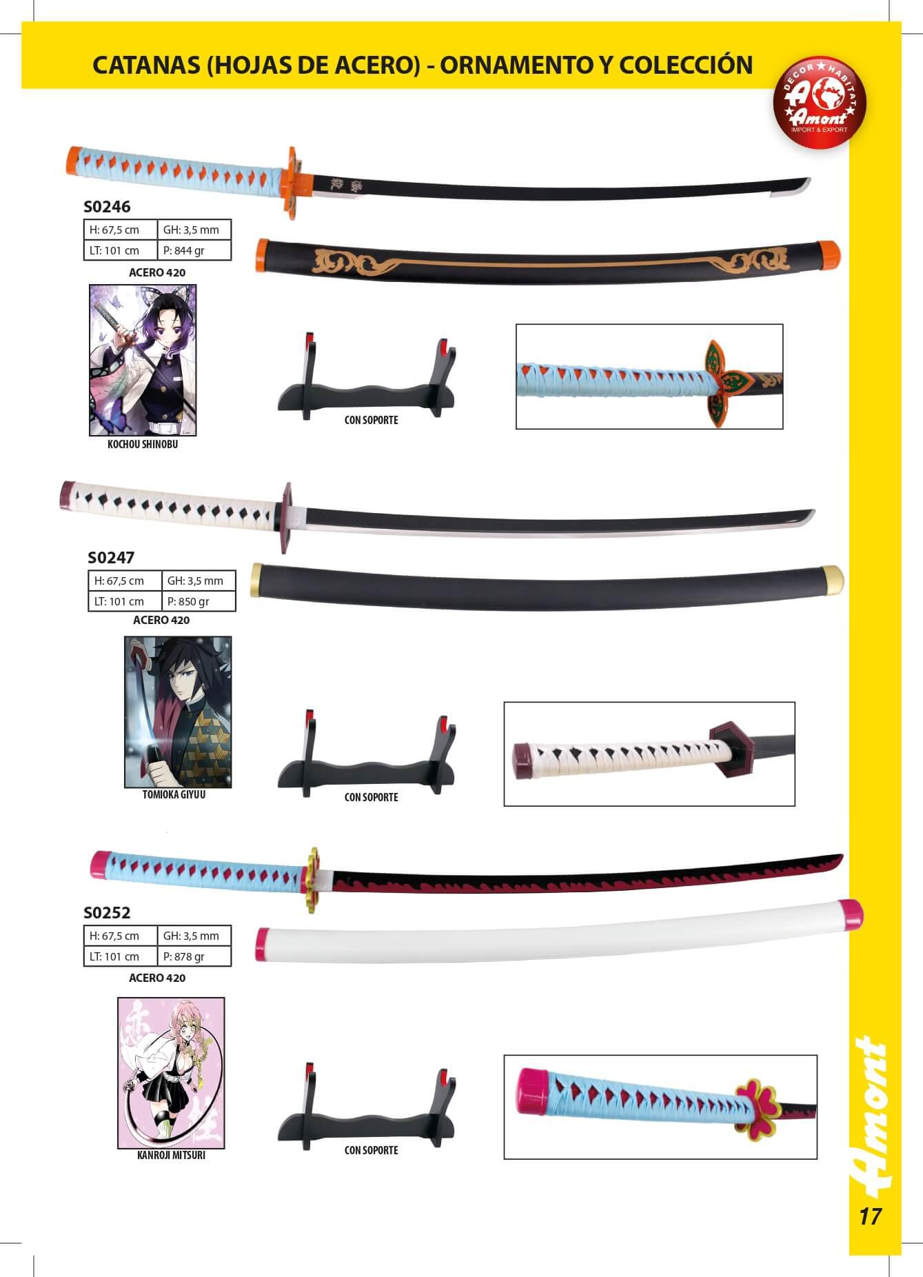 Katanas Demon SlayerLongitud de hoja: 67,5 cm. Longitud total: 101 cm. - S0246: Kochou Shinobu - S0247: Tomioka Giyuu - S0248: Kanrojimitsuri Estos modelos de katanas incluyen soporte.